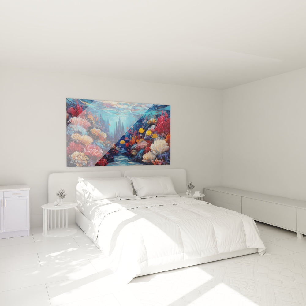 Ce tableau mural fonds marins présente une vision saisissante d'un récif corallien multicolore dans toute sa splendeur sous-marine. L'œuvre dépeint un écosystème aquatique vibrant où se mélangent harmonieusement coraux rouges, roses et blancs aux formes organiques complexes. Les poissons tropicaux jaunes nagent gracieusement entre les formations coralliennes, apportant une touche de vie dynamique à cette scène sous-marine artistique. La lumière filtrée par la surface de l'eau crée des jeux d'ombres et de reflets qui donnent une profondeur remarquable à cette peinture récif corallien. Les détails minutieux des anémones de mer et des coraux branchus témoignent d'une maîtrise artistique exceptionnelle. Cette décoration murale marine transforme instantanément l'espace en fenêtre sur les merveilles des fonds marins tropicaux. L'artiste a su capturer l'essence même de la biodiversité marine, créant une œuvre d'art aquatique qui évoque la sérénité et la beauté des profondeurs océaniques. Chaque élément de ce tableau coraux colorés contribue à créer une atmosphère immersive et apaisante.