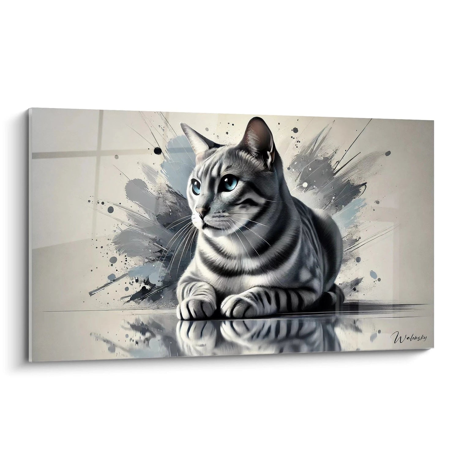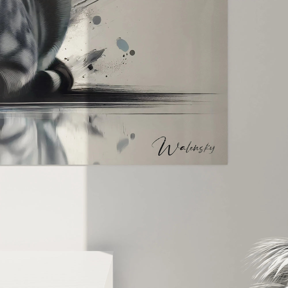 Les éclats argentés et les nuances profondes de gris et noir apportent à ce tableau une dimension contemporaine et presque cosmique. L’arrière-plan abstrait n’est pas simplement décoratif : il symbolise la richesse intérieure de l’animal, ses émotions vibrantes et son esprit éveillé. Cette juxtaposition crée un effet fascinant où la quiétude du félin se nourrit d’une dynamique vibrante, procurant une atmosphère à la fois apaisante et intrigante.