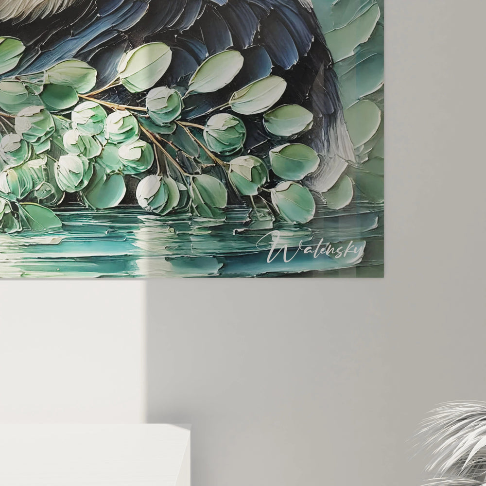 Ce tableau ne se contente pas d’habiller vos murs, il crée une ambiance. Les nuances subtiles de vert, bleu et blanc s’entrelacent délicatement pour évoquer la fraîcheur d’un bassin paisible, où l’eau caresse doucement les feuilles qui entourent l’animal. Vous pouvez presque entendre le murmure léger des branches bercées par une brise tendre. En le contemplant, un sentiment de repos profond s’installe, invitant à la méditation et à la sérénité.