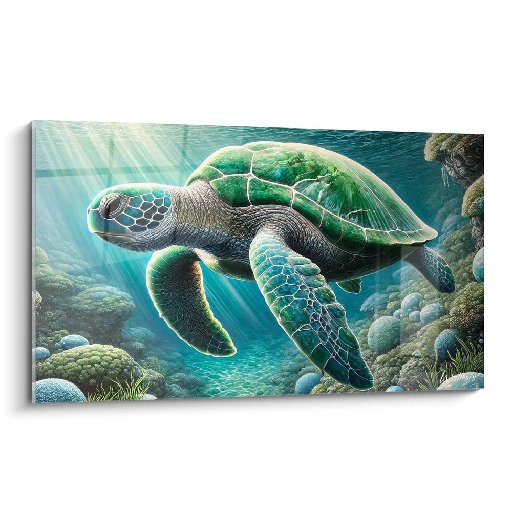 Ce tableau invite à un voyage sensoriel, où chaque regard posé sur la tortue évoluant lentement parmi les reflets lumineux procure une sensation d’apaisement immédiate. Les nuances subtiles de vert et de bleu évoquent l’immensité des eaux profondes tandis que les touches de beige rappellent la carapace robuste de cette créature mythique. En exposant cette œuvre, c’est comme si l’air marin et la douceur légère des vagues s’invitaient chez vous, transformant votre intérieur en un sanctuaire de calme.