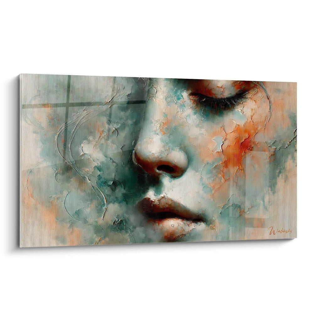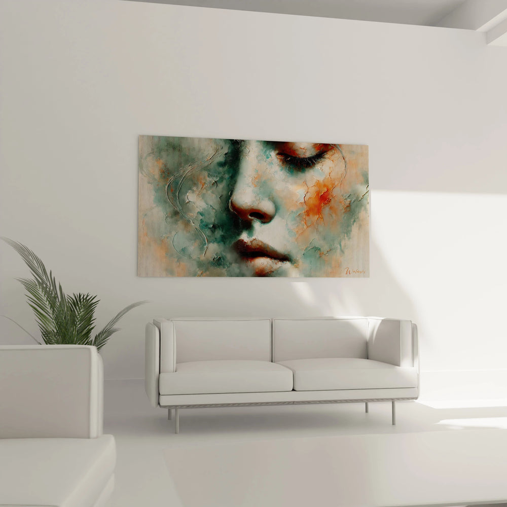 Chaque détail de ce tableau est une ode à cette connexion fragile qui unit l’humain à son environnement. Les teintes enveloppantes de vert profond et d’orange brûlé se fondent en un voile délicat, rappelant la sensation d’une brise légère caressant la peau lors d’une promenade en forêt. Ce visage abstrait, presque éthéré, invite à la rêverie et au voyage intérieur, comme si vous pouviez percevoir l’écho de souvenirs enfouis, portés par le murmure du vent.