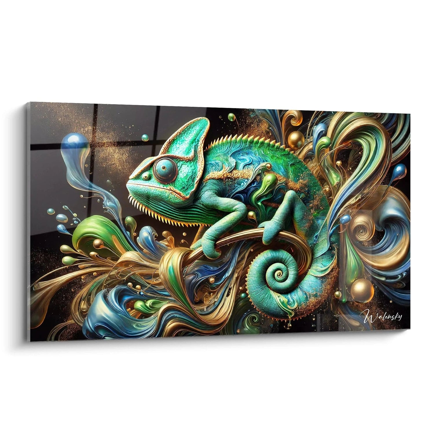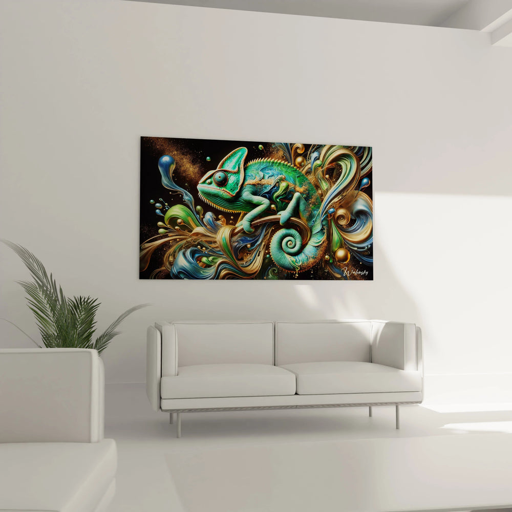 Imaginez la texture rugueuse de la peau du caméléon, sa silhouette élégante se fondant dans un tourbillon de nuances vert, bleu et or. Les couleurs vibrantes évoquent la richesse émeraude de la forêt, les éclats dorés du soleil filtrant à travers la canopée, et la fraîcheur apaisante des airs tropicaux. Chaque regard sur cette œuvre vous invite à redécouvrir la beauté changeante et insaisissable de la nature.