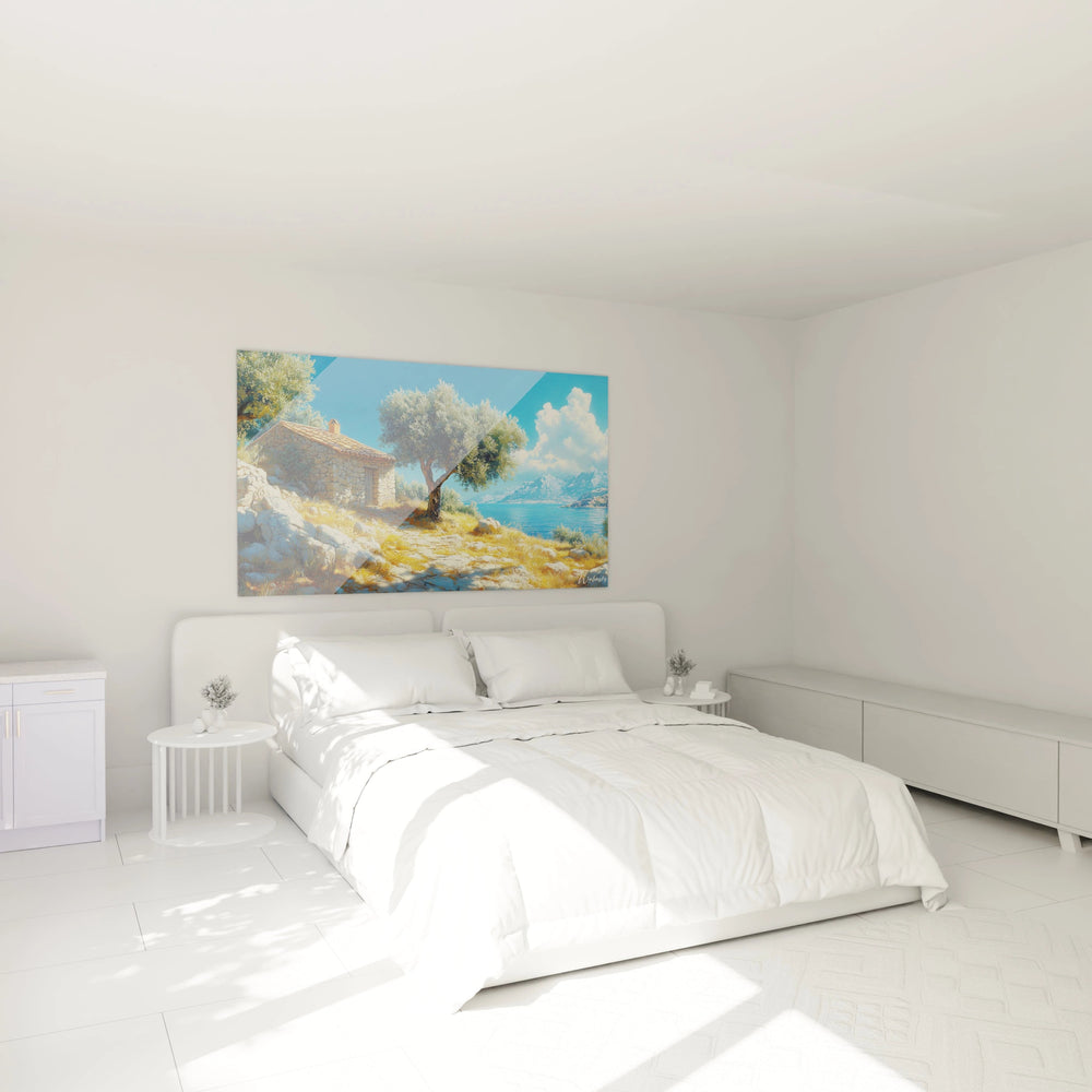 Plus qu’un simple décor, ce tableau est une expérience immersive qui fait appel à vos sens. Vous sentez presque la fraîcheur de la brise marine caresser votre peau, entendez le doux bruissement des feuilles d’olivier et percevez la chaleur lumineuse d’un soleil finissant sa course. Il incarne cette quiétude rare où le temps s’arrête, offrant à votre intérieur une bulle d’harmonie et d’évasion.