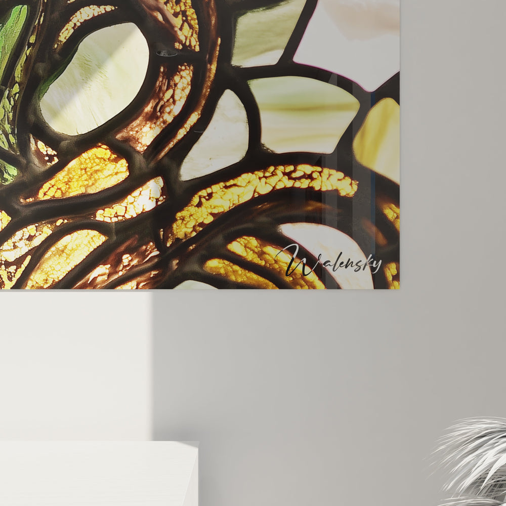L’œuvre déploie un magistral équilibre de teintes chaudes et vibrantes : or éclatant, vert émeraude profond, et bordeaux velouté se mêlent dans une composition parfaitement maîtrisée, évoquant les vitraux des grandes cathédrales, où chaque fragment joue avec la lumière naturelle. Cette technique apporte à votre intérieur une atmosphère chaleureuse, à la fois élégante et empreinte de caractère.