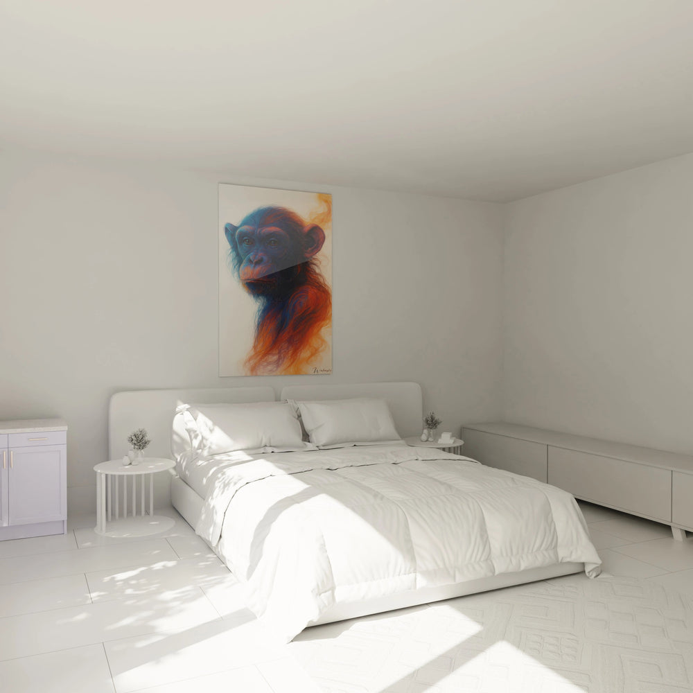 Ce tableau néo-expressionniste se déploie avec une fluidité presque hypnotique, ses tonalités de bleu profond, d’orange vibrant et de beige délicat s’entremêlant pour évoquer un mythe vivant qui s’échappe des frontières du réel. Le primate, silhouette à la fois définie et évanescente, semble venir d’un autre monde pour poser un regard perçant, une invitation à l’introspection et au dialogue intérieur. La texture vaporeuse et les formes organiques dansent sous vos yeux, insufflant à chaque regard un nouvel éclat d’émotion et de mystère.