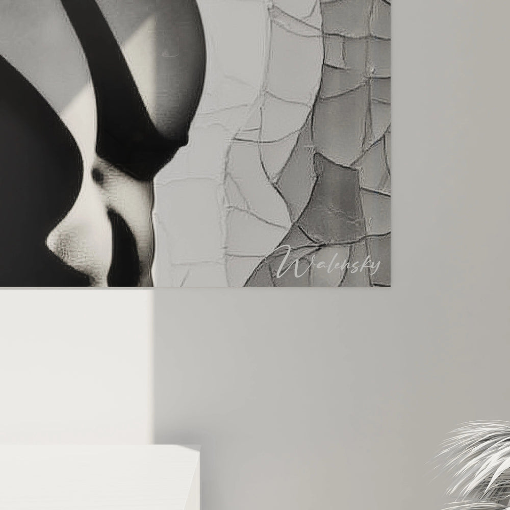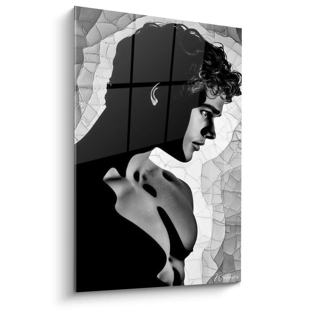 Ce tableau mural portrait masculin présente un portrait masculin d'une beauté masculine saisissante, capturé dans un style noir et blanc qui révèle toute l'intensité de la condition masculine contemporaine. L'œuvre dépeint un homme aux traits finement ciselés, dont le profil noble évoque les plus grandes traditions du portrait classique. Sa chevelure bouclée, méticuleusement détaillée, encadre un visage aux pommettes hautes et à la mâchoire définie, témoignant d'une masculinité à la fois forte et sensible. Le regard, dirigé vers l'horizon, exprime une profonde mélancolie et une introspection qui touchent l'observateur au cœur. La composition photographique joue magistralement sur les contrastes entre lumière et ombre, créant un clair-obscur moderne qui rappelle les maîtres de la peinture baroque. L'arrière-plan, constitué d'une mosaïque aux fragments brisés, ajoute une dimension symbolique forte à l'ensemble, suggérant la complexité de l'âme humaine et les cicatrices invisibles de l'existence. La main délicatement positionnée près du visage apporte une note de vulnérabilité qui contraste avec la force apparente du sujet. Cette représentation de la beauté masculine transcende les codes esthétiques traditionnels pour proposer une vision contemporaine et nuancée de l'homme moderne, entre force et fragilité, assurance et questionnement. Ce tableau mural beauté masculine offre une décoration murale portrait exceptionnelle pour les intérieurs raffinés.
