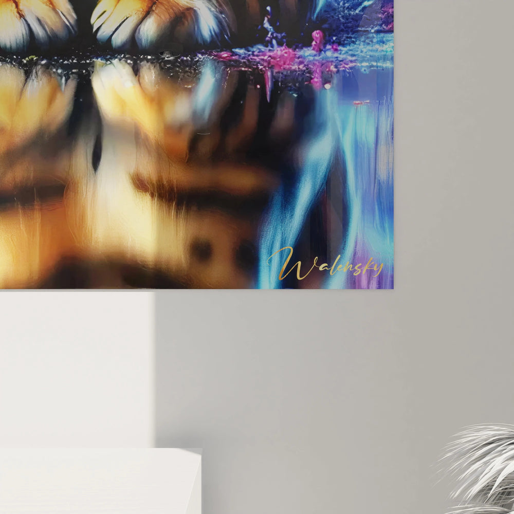 Imaginez ce chat dont les yeux semblables à des saphirs vous fixent avec une profondeur troublante, comme une fenêtre ouverte sur un monde mystérieux et vibrant. Ce regard puissant attire votre attention, vous captive et vous transporte, éveillant instantanément un sentiment d’émerveillement. Autour de lui, une explosion de couleurs énergisantes – nuances de bleu profond, éclats de violet mystique et touches lumineuses de jaune solaire – danse avec audace en arrière-plan, insufflant un souffle de vie et d’audace à votre pièce.