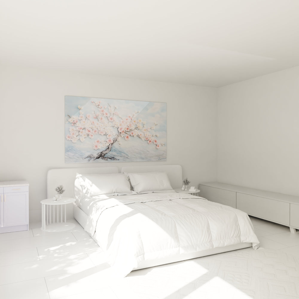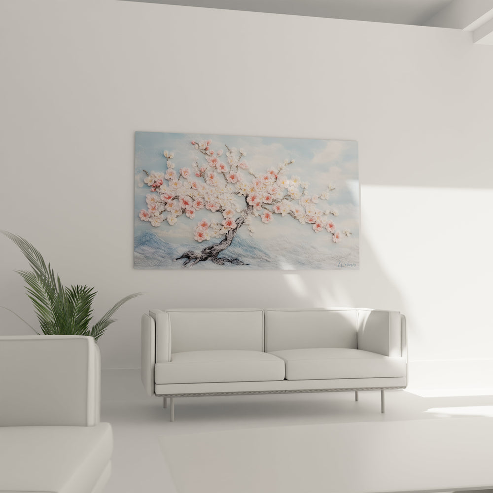 Ce tableau ne se contente pas d’habiller votre mur : il invite à la contemplation. Les fleurs sculptées en textures crochetées offrent un toucher presque palpable, tandis que le tronc noueux apporte une robustesse contrastée qui ancre l’ensemble. Les nuances délicates de rose tendre, blanc nacré et bleu pastel créent une atmosphère douce et apaisante. Selon la lumière et l’angle d’observation, les reliefs prennent vie, restant toujours fascinants et envoûtants.