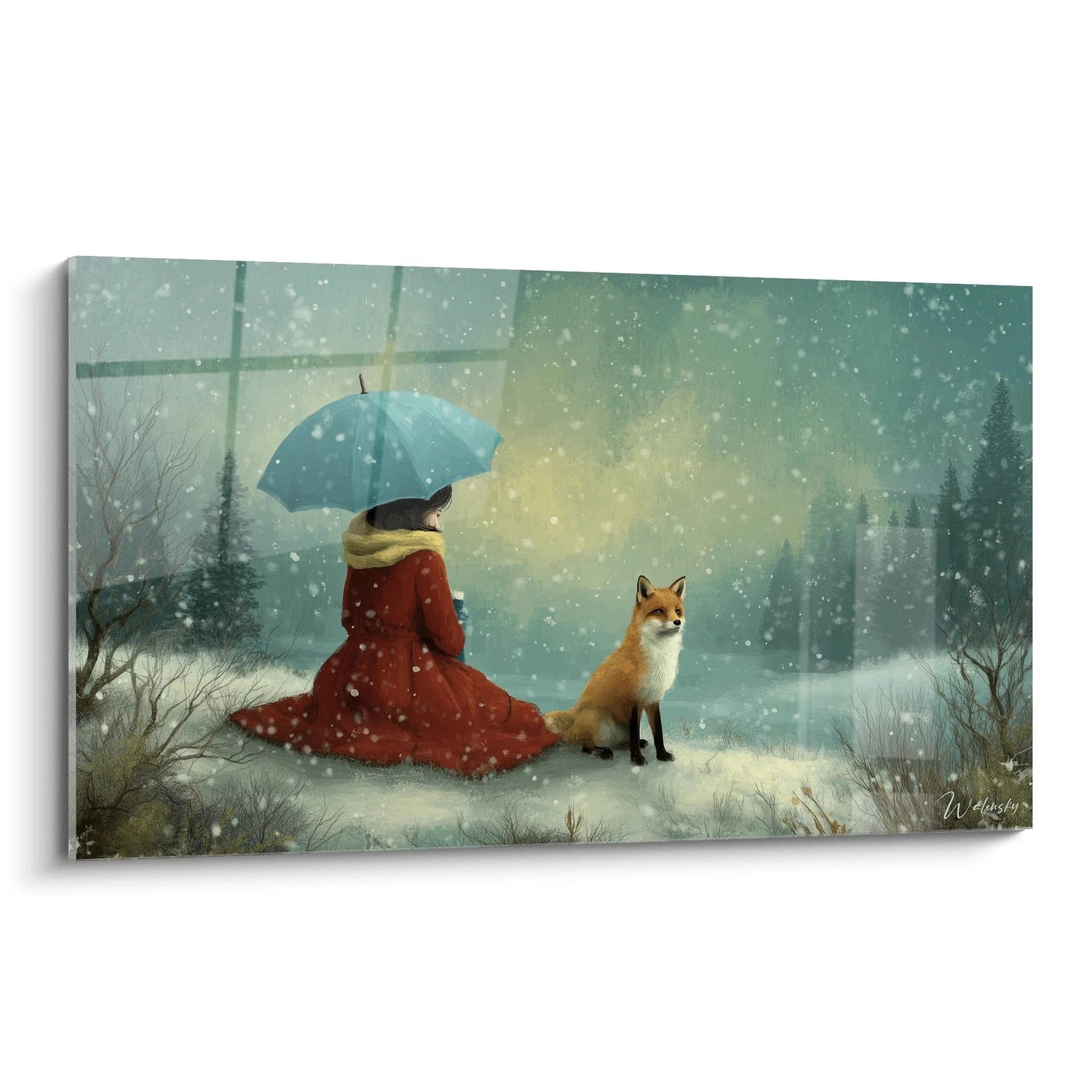 Cette œuvre captivante présente une scène hivernale extraordinaire où un tableau renard neige révèle une rencontre magique entre l'humanité et la nature sauvage. Au centre de la composition, une femme en manteau rouge écarlate se tient assise dans un paysage enneigé, protégée par un parapluie turquoise vibrant. À ses côtés, un renard roux majestueux l'observe avec une présence sereine et contemplative. Les flocons de neige dansent délicatement dans l'atmosphère brumeuse, créant une ambiance onirique qui transforme ce tableau renard hiver en une véritable invitation à la rêverie. Cette décoration murale renard se distingue par son atmosphère paisible et sa palette chromatique subtile qui évoque la poésie des paysages hivernaux nordiques.