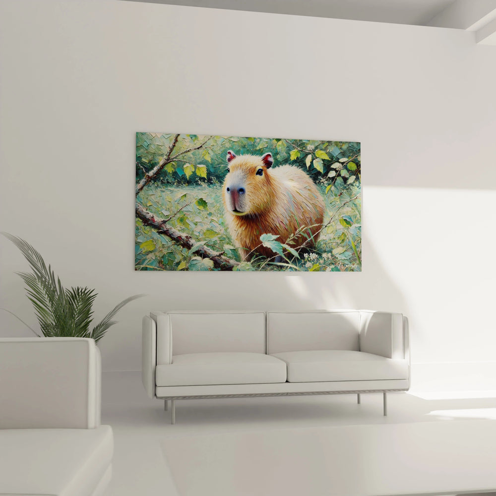 Imaginez ce tableau accroché dans votre salon ou votre espace de travail : les nuances profondes de verts émeraude, de bruns chaleureux et de beiges délicats créent un cocon visuel qui apaise les sens et invite à la contemplation. Le regard tendre et posé du capybara vous propose un moment suspendu, où le temps ralentit, vous permettant de retrouver une quiétude rare en pleine nature.