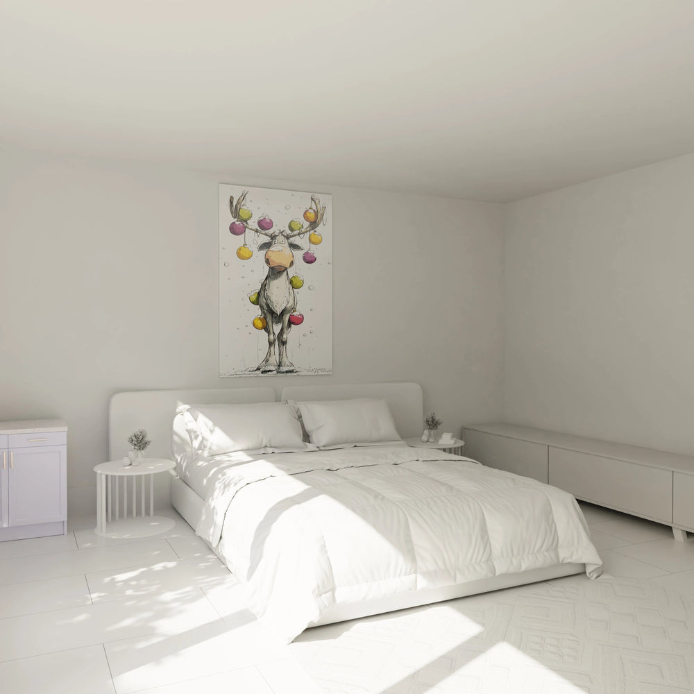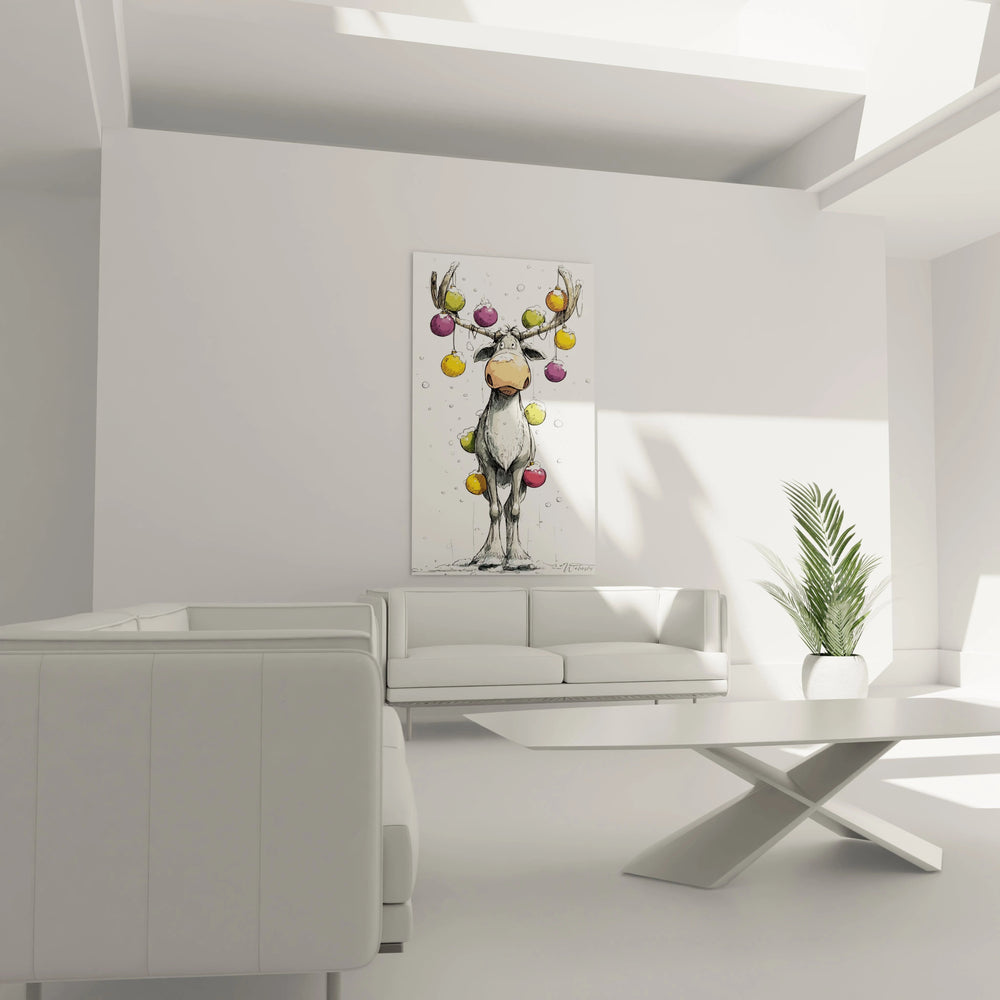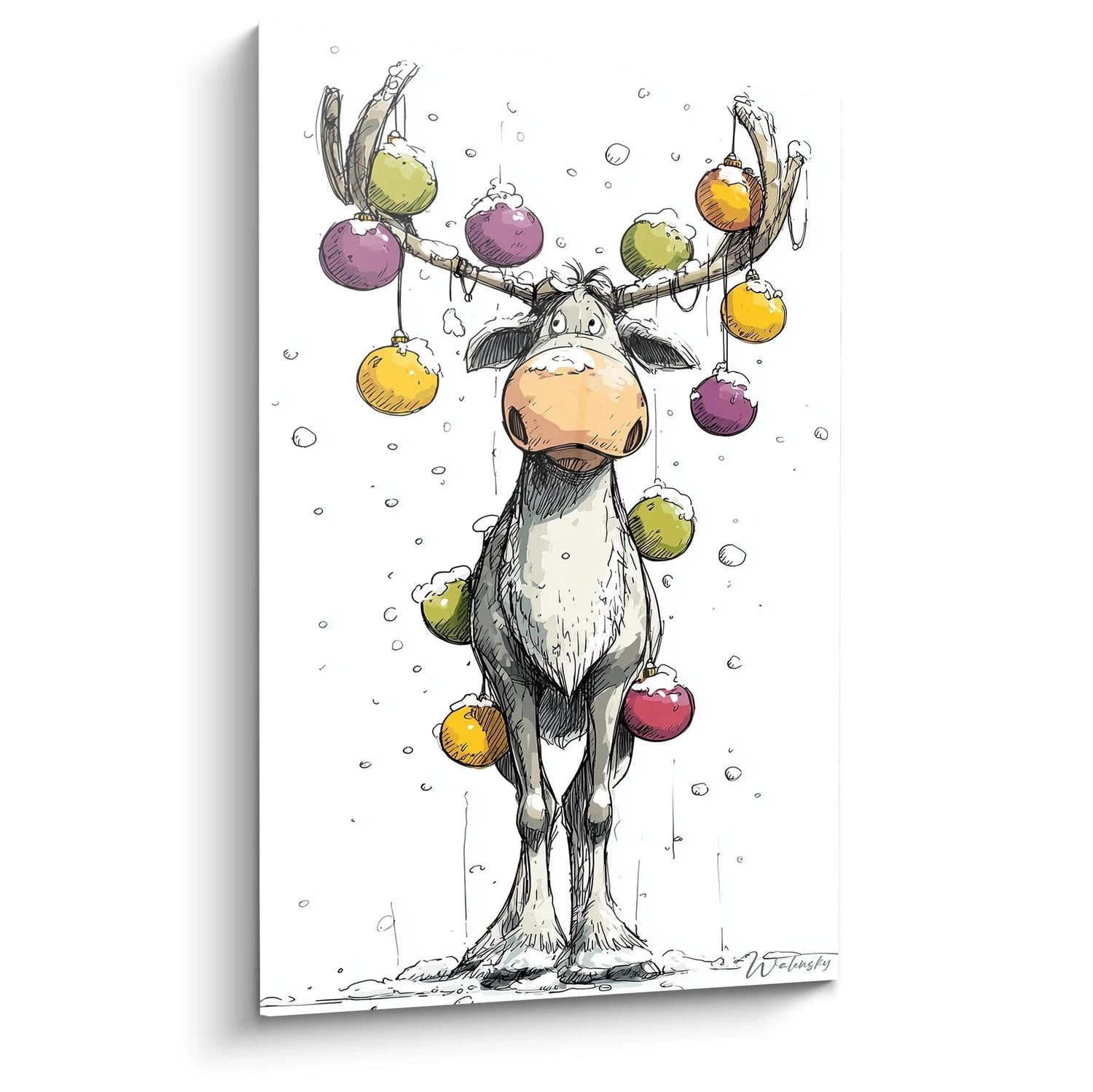 Ce tableau renne présente un cervidé anthropomorphique au style cartoon distinctif, ornementé de multiples boules de Noël colorées suspendues à ses bois majestueux. L'œuvre capture l'expression touchante de l'animal avec ses grands yeux expressifs et son museau proéminent, créant une atmosphère à la fois humoristique et attendrissante. Le tableau renne décoratif se distingue par sa composition verticale qui met en valeur la stature imposante du personnage. Des flocons de neige délicats parsèment l'arrière-plan blanc immaculé, ajoutant une dimension festive à cette décoration murale renne au charme indéniable.