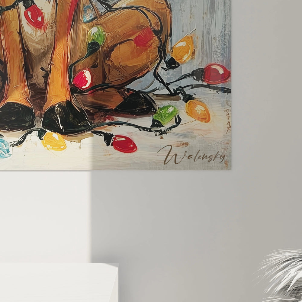 Ce tableau, véritable pièce maîtresse, évoque une scène joyeuse où des rennes dansent sous une pluie d'ampoules scintillantes. La lumière et la couleur insufflent une vie nouvelle à votre espace, suscitant des sourires et des conversations autour des souvenirs d’enfance et des moments de partage. Imaginez-vous, assis confortablement dans votre salon, enveloppé dans la lumière chaleureuse de ce tableau inspirant, écoutant les rires de vos proches tout en savourant une tasse de chocolat chaud.