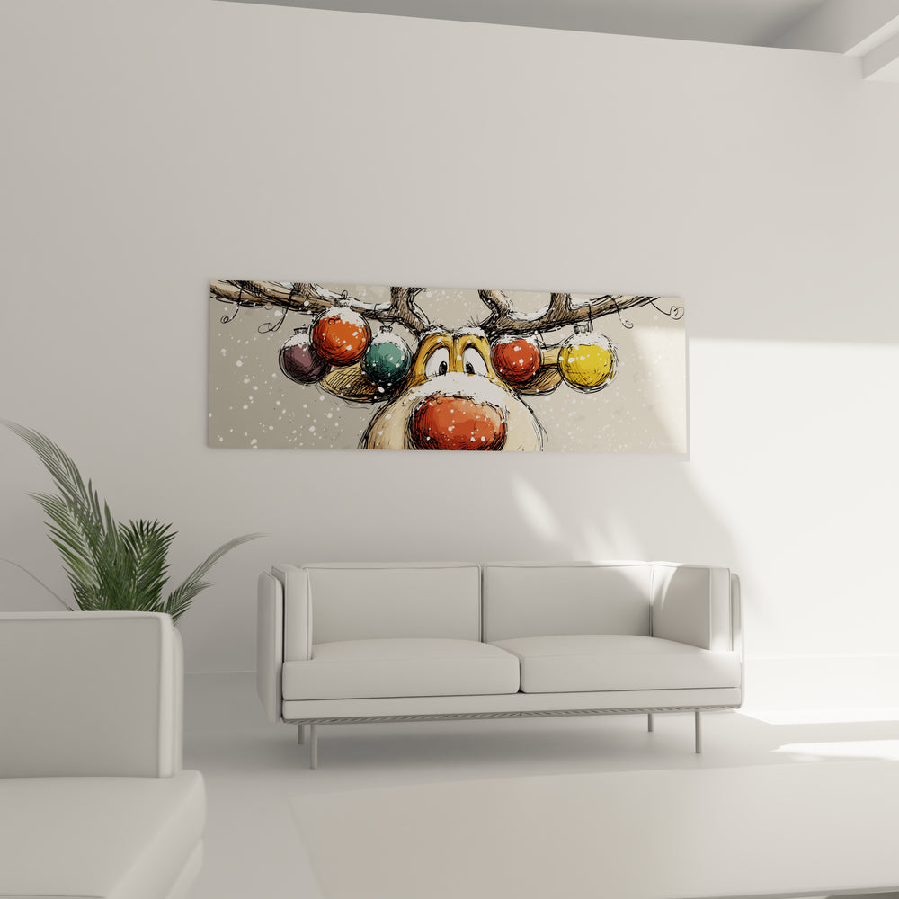 Cette art mural renne festif exploite des contrastes subtils entre les teintes froides du fond et les couleurs vives des ornements, créant une profondeur visuelle remarquable.
