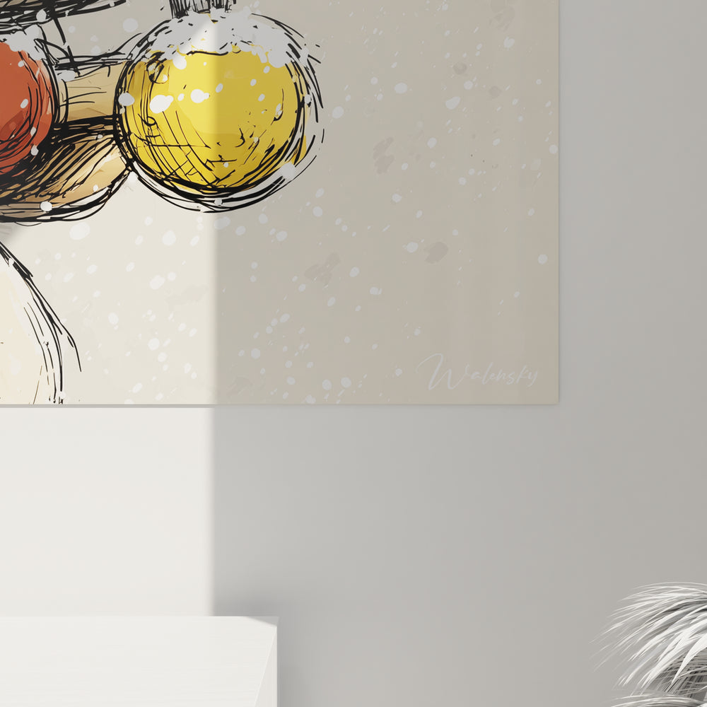 Ce tableau renne présente un personnage central touchant avec son regard expressif et bienveillant. L'œuvre capture immédiatement l'attention par la présence imposante du renne au centre de la composition, entouré de boules de Noël colorées suspendues à des branches esquissées. Le tableau renne décorations festives révèle une ambiance chaleureuse grâce à la technique de dessin au trait libre qui donne une impression de spontanéité et d'authenticité. Les flocons de neige parsemés sur toute la surface renforcent l'atmosphère hivernale de cette décoration murale renne exceptionnelle.