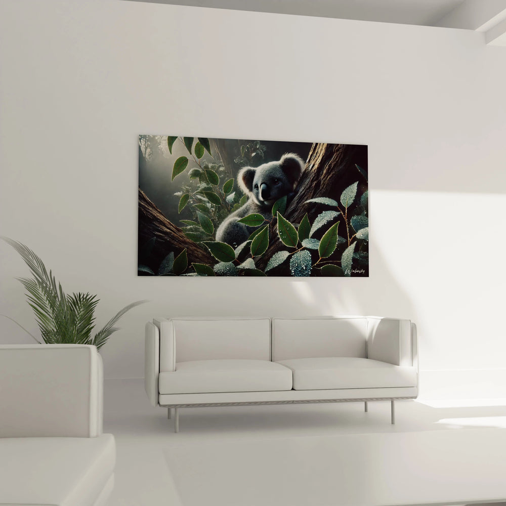 Imaginez un instant suspendu entre ciel et terre, où la douceur d’un matin en forêt enveloppe votre intérieur d’une atmosphère paisible et chaleureuse. Ce tableau Repos en Forêt - Édition Koala Animaux vous transporte au cœur d’une clairière baignée par la lumière tamisée de l’aube, où un koala en pleine quiétude se repose contre un arbre majestueux, protégé par un écrin de feuilles délicatement éclairées.