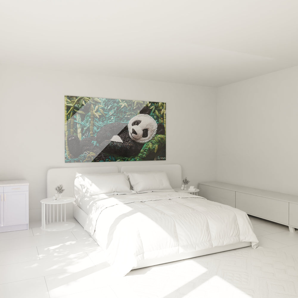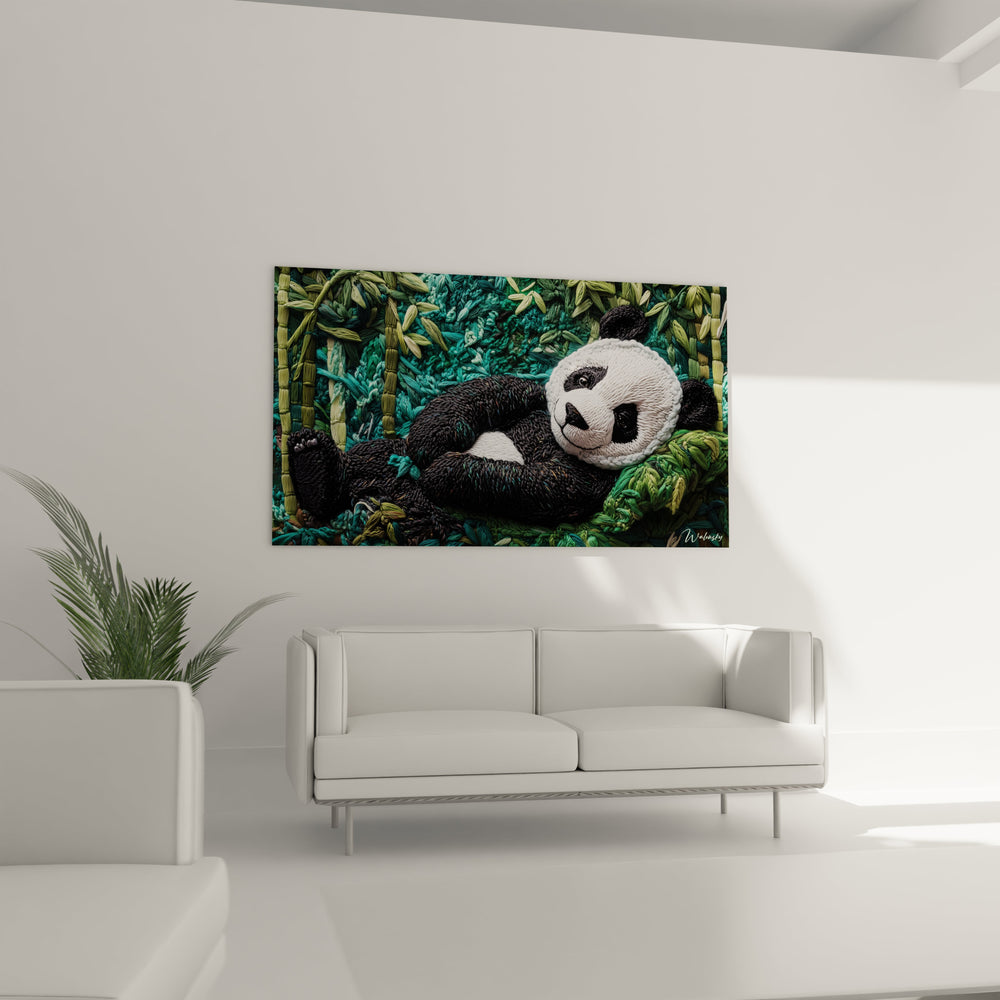La composition de cette œuvre place stratégiquement le panda au centre droit, allongé dans une posture détendue qui occupe les deux tiers de l'espace. Les tiges de bambou encadrent délicatement l'animal, créant une structure verticale qui guide le regard vers le sujet principal. La perspective est conçue pour donner l'impression d'observer l'animal dans son habitat naturel, comme à travers une fenêtre sur un moment privilégié de repos.