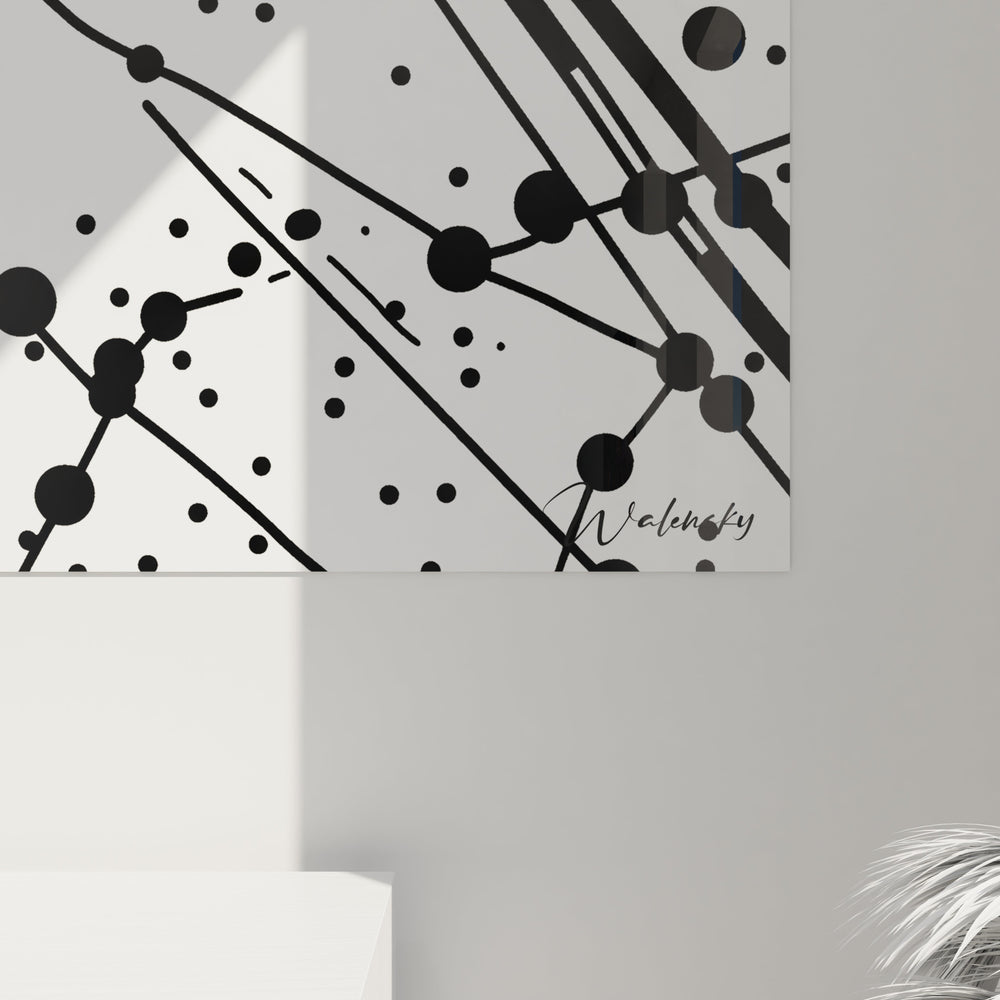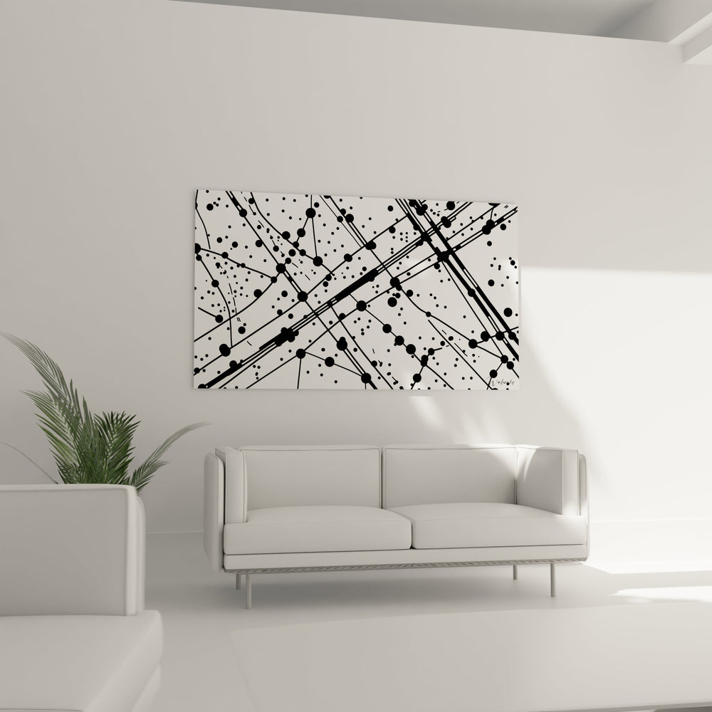 Ce tableau connexions se distingue par son réseau complexe de lignes entrecroisées et de points dispersés sur fond blanc immaculé. L'œuvre présente une cartographie abstraite où chaque élément noir semble magnétiquement attiré vers les autres, créant un système visuel d'une richesse extraordinaire. Cette tableau connexions abstraites géométriques capture l'essence même des réseaux contemporains, qu'ils soient neuronaux, technologiques ou sociaux. Les premières impressions révèlent une densité variable qui guide naturellement le regard vers les zones de convergence les plus intenses, où les lignes se multiplient et s'entremêlent. L'aspect distinctif réside dans cette capacité à représenter simultanément l'ordre et le chaos, créant une tension visuelle fascinante qui maintient l'attention.