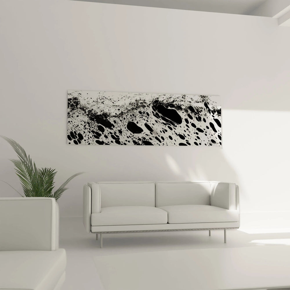 Ce tableau abstrait présente une composition dynamique dominée par des formes organiques et des éclaboussures expressives en noir et blanc. L'œuvre révèle immédiatement son caractère spontané et émotionnel à travers un ensemble de motifs fluides qui évoquent un mouvement perpétuel. Les contrastes saisissants créent une tension visuelle captivante, tandis que la tableau abstrait noir et blanc moderne structure révèle une complexité remarquable. L'aspect tacheté caractéristique de cette création génère une profondeur inattendue qui attire le regard et maintient l'attention. Cette décoration murale abstraite contemporaine s'impose par sa force expressive et son originalité artistique indéniable.