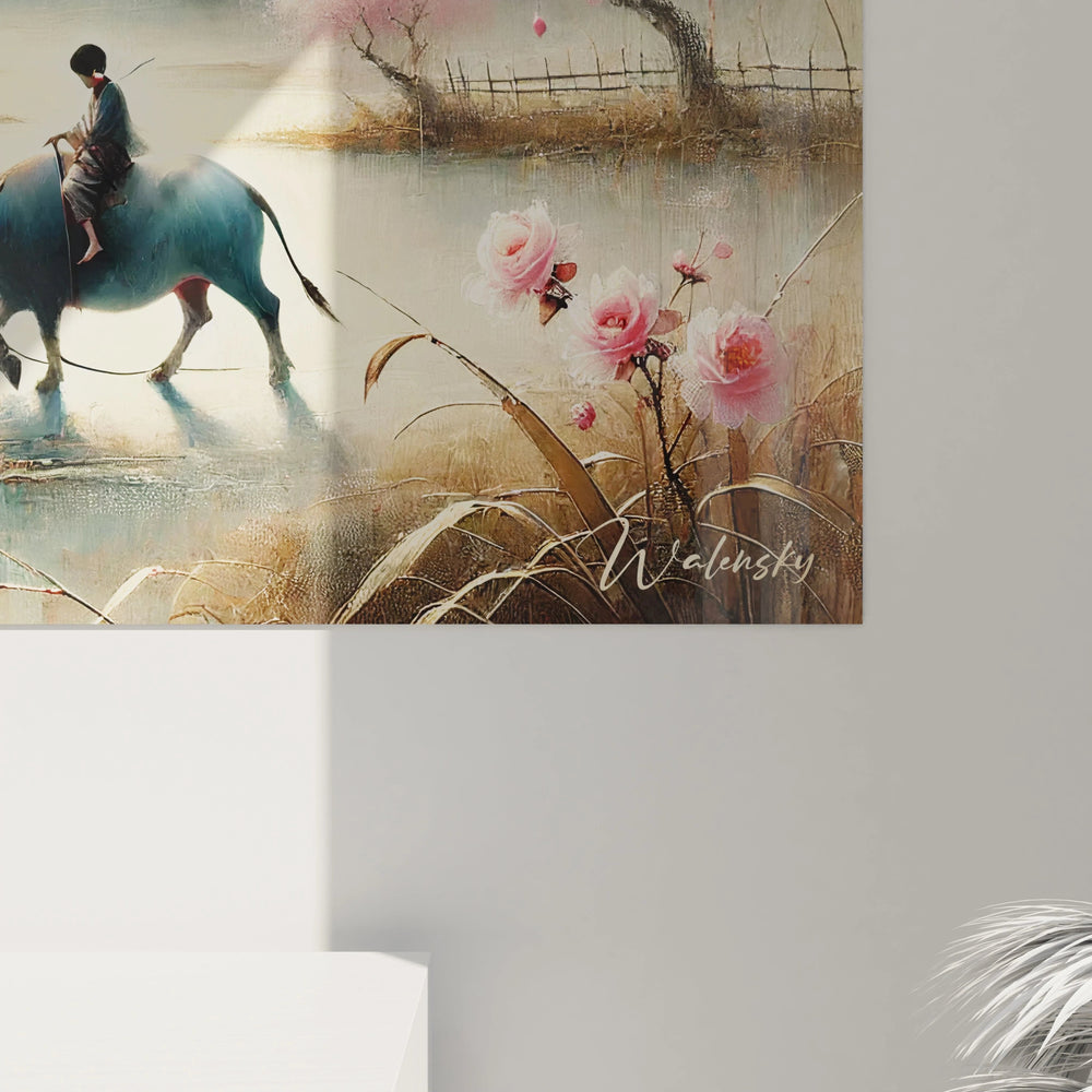 Cette œuvre puise son essence dans les paysages ruraux chinois et leurs philosophies profondes. Elle célèbre le respect de la nature et la simplicité de la vie, offrant un instant d’évasion et de sérénité au cœur de votre décoration. L’image de l’enfant sur le buffle rappelle également l’innocence et la pureté, renforçant ce sentiment de douceur et d’équilibre.