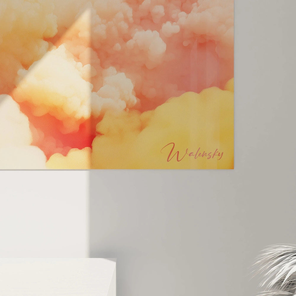 Ce tableau nuages présente une composition atmosphérique exceptionnelle où les formations nuageuses se déploient dans un ballet chromatique saisissant. Cette décoration murale nuages captive immédiatement par sa texture vaporeuse et ses transitions colorées fluides. Le tableau nuages expressionniste révèle une approche artistique moderne où les masses nuageuses semblent flotter dans un espace tridimensionnel imaginaire. Les nuances passent du turquoise profond aux oranges chaleureux, créant une atmosphère onirique qui transforme l'espace d'exposition. Cette œuvre nuages évoque instantanément une sensation de légèreté et d'évasion, transportant l'observateur dans un univers contemplatif.