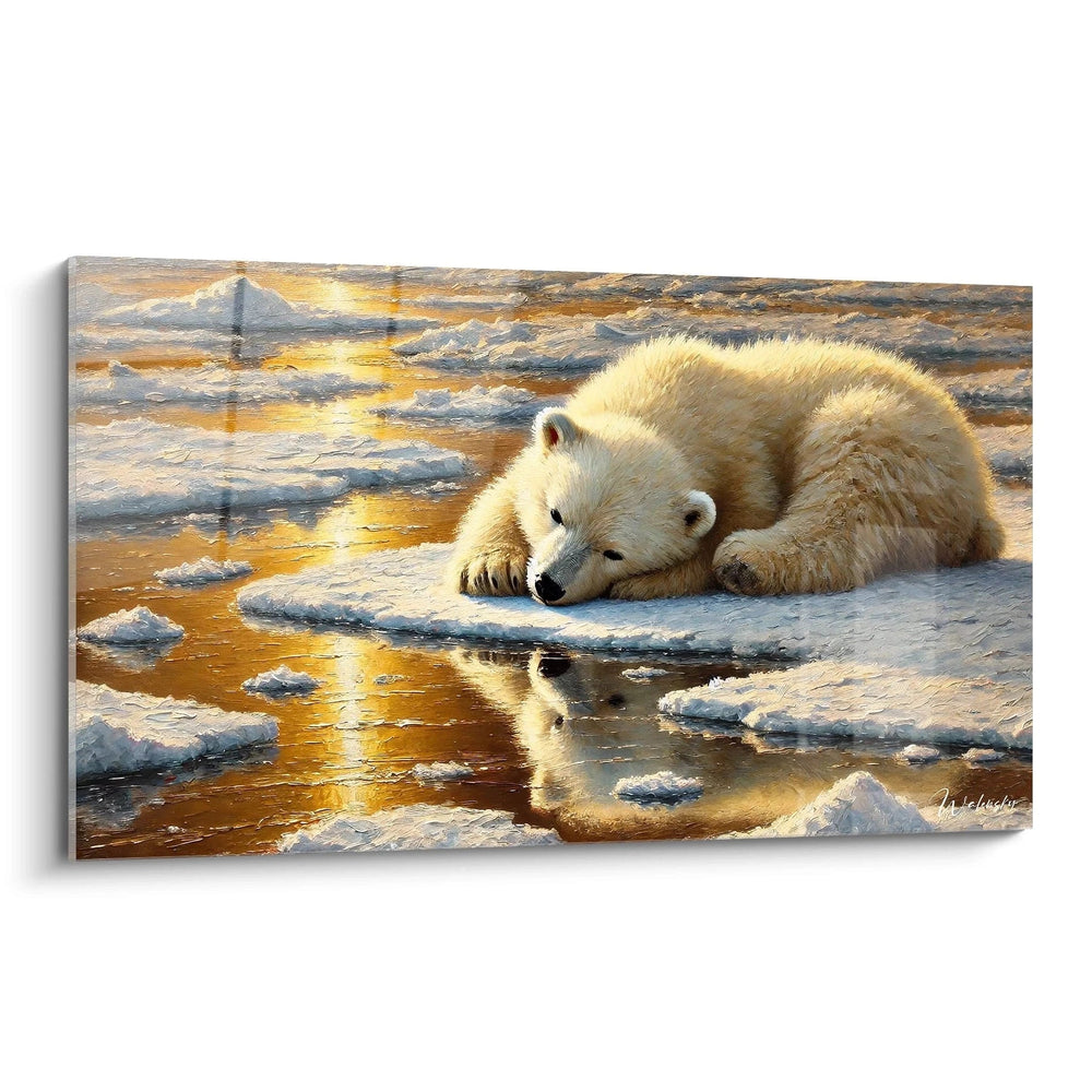Imaginez un instant suspendu, où la froideur immaculée de l'Arctique s’adoucit sous un voile de lumière dorée. Le Tableau Rêve de Glace capture ce moment rare et précieux : un ours polaire, paisiblement étendu sur la banquise, baigné par les derniers rayons du soleil couchant. Cette œuvre vous transporte immédiatement dans cet univers où le silence et la douceur règnent en maîtres, offrant un véritable refuge de calme pour votre intérieur.
