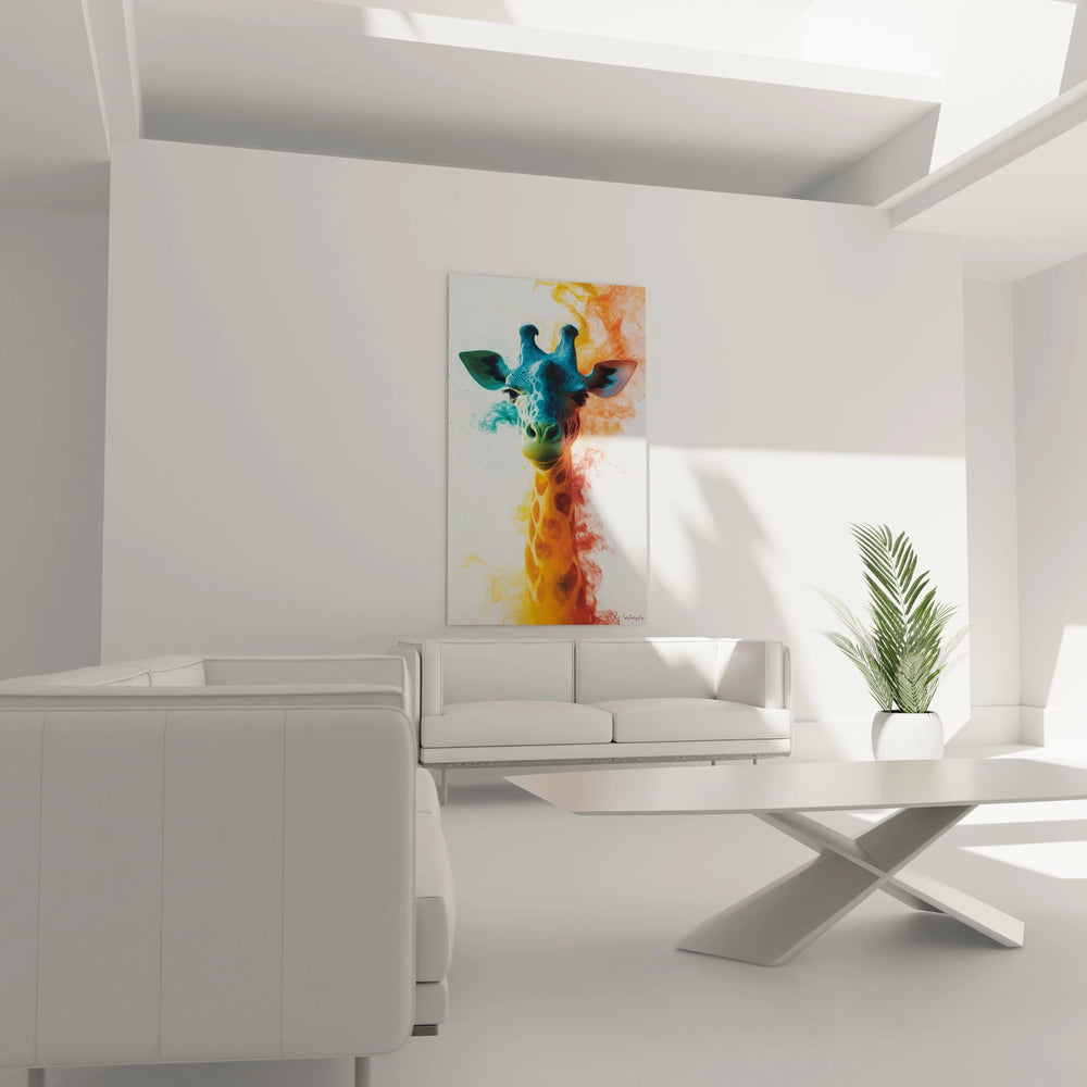 Ce tableau girafe coloré offre une vision saisissante d'un animal majestueux transformé par un jeu d'encres fluides. L'œuvre présente une girafe dont la silhouette se dissout progressivement dans un nuage de couleurs vibrantes, créant un contraste puissant entre réalisme animal et abstraction artistique. La tête bleu turquoise se détache immédiatement sur fond clair, tandis que le cou caractéristique se fond dans des nuances chaudes orangées et jaunes. Cette décoration murale animalière captive instantanément par sa dualité entre précision anatomique et dissolution chromatique.
