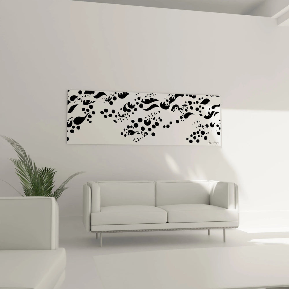 La composition de ce tableau abstrait organique révèle une organisation subtile malgré son apparence spontanée. Les formes principales s'articulent autour d'un axe central invisible, créant un équilibre dynamique. Les éléments les plus volumineux occupent stratégiquement les zones de force du cadre, tandis que les points plus petits ponctuent l'ensemble comme des notes musicales. Cette œuvre abstraite murale exploite brillamment la règle des tiers, plaçant les masses importantes aux intersections visuelles clés. La perspective suggère un mouvement de gauche à droite, comme si les formes étaient emportées par un courant invisible. L'espace négatif blanc joue un rôle crucial, permettant aux formes noires de respirer et de créer leur propre rythme visuel.