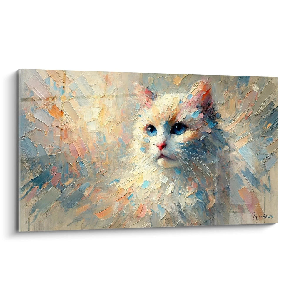 Ce tableau est né d’un souvenir précieux, celui d’une matinée enveloppée de lumière tamisée, où la présence du chat semble presque irréelle, comme une apparition éthérée. Son regard bleu profond vous invite à contempler au-delà des apparences, à plonger dans une rêverie subtile où la douceur rencontre la force tranquille. Chaque texture, chaque nuance pastel est pensée pour évoquer une émotion chaleureuse et apaisante, une parenthèse de sérénité dans votre quotidien.