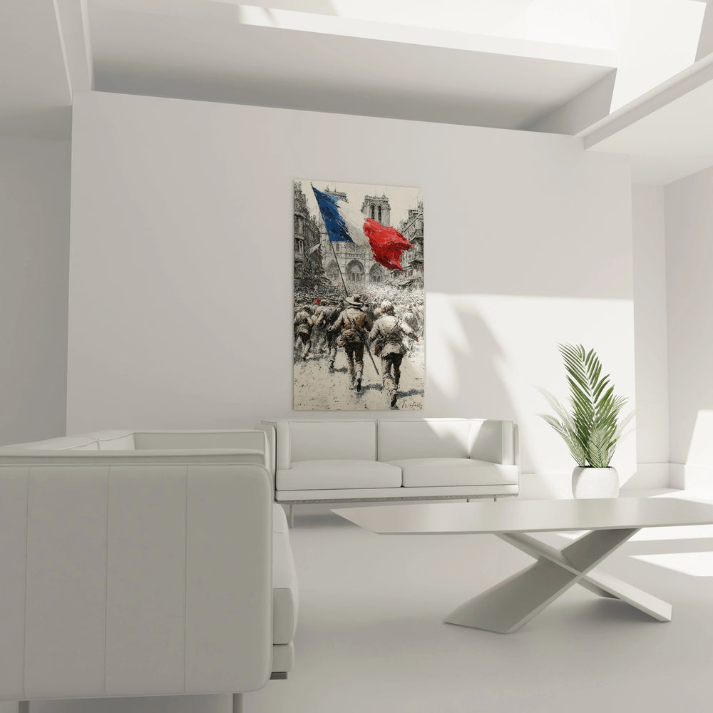 Cette œuvre révolution française trouvera sa place idéale dans un environnement qui respecte sa dimension historique et émotionnelle. Un éclairage dirigé mettra parfaitement en valeur les empâtements du drapeau tricolore et créera des jeux d'ombres dramatiques qui renforceront l'impact visuel. Les murs aux tonalités neutres, beiges ou gris clair, constitueront un écrin parfait pour cette décoration murale patriotique française. L'association avec d'autres œuvres historiques ou des meubles de style classique français créera une harmonie décorative cohérente. Cette création s'épanouira particulièrement dans des espaces au caractère affirmé : bureau, bibliothèque, salon de réception, où elle pourra dialoguer avec l'architecture et insuffler son énergie patriotique à l'ensemble de la pièce.
