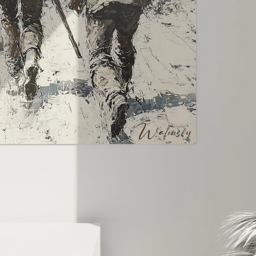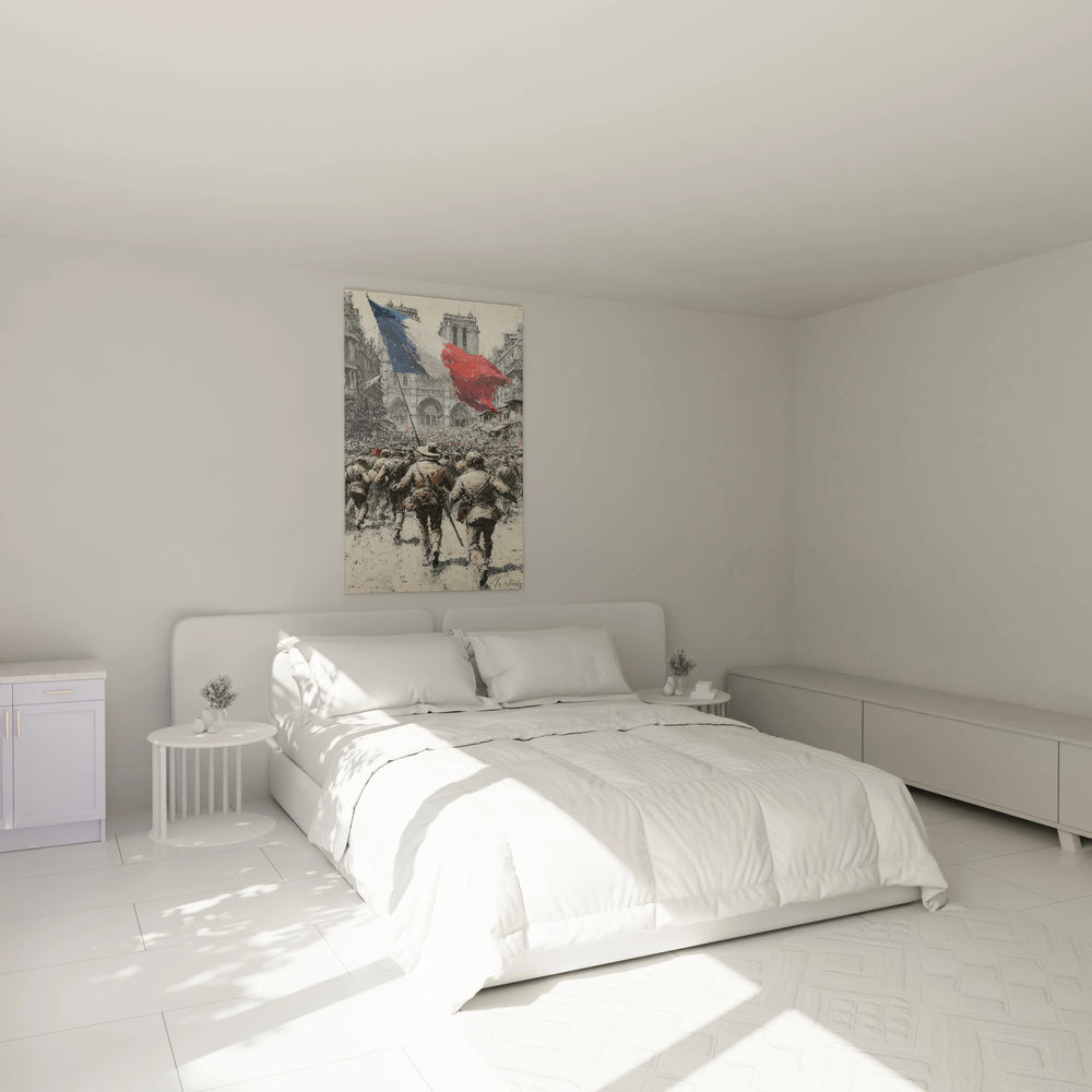 L'unicité de ce tableau révolutionnaires français historique réside dans sa capacité à transcender la simple représentation pour devenir un témoignage émotionnel puissant. L'artiste a su capter l'essence même de l'élan révolutionnaire, transformant une scène historique en expérience visuelle immersive. Cette art mural patriotique français se distingue par son traitement contemporain d'un sujet classique, mêlant références historiques précises et sensibilité artistique moderne. La signature distinctive visible dans l'angle inférieur témoigne de l'authenticité de l'œuvre. Les détails vestimentaires des révolutionnaires, leurs expressions déterminées et la gestuelle héroïque du porteur de drapeau constituent autant d'éléments uniques qui différencient cette création de toute autre représentation de la période révolutionnaire française.