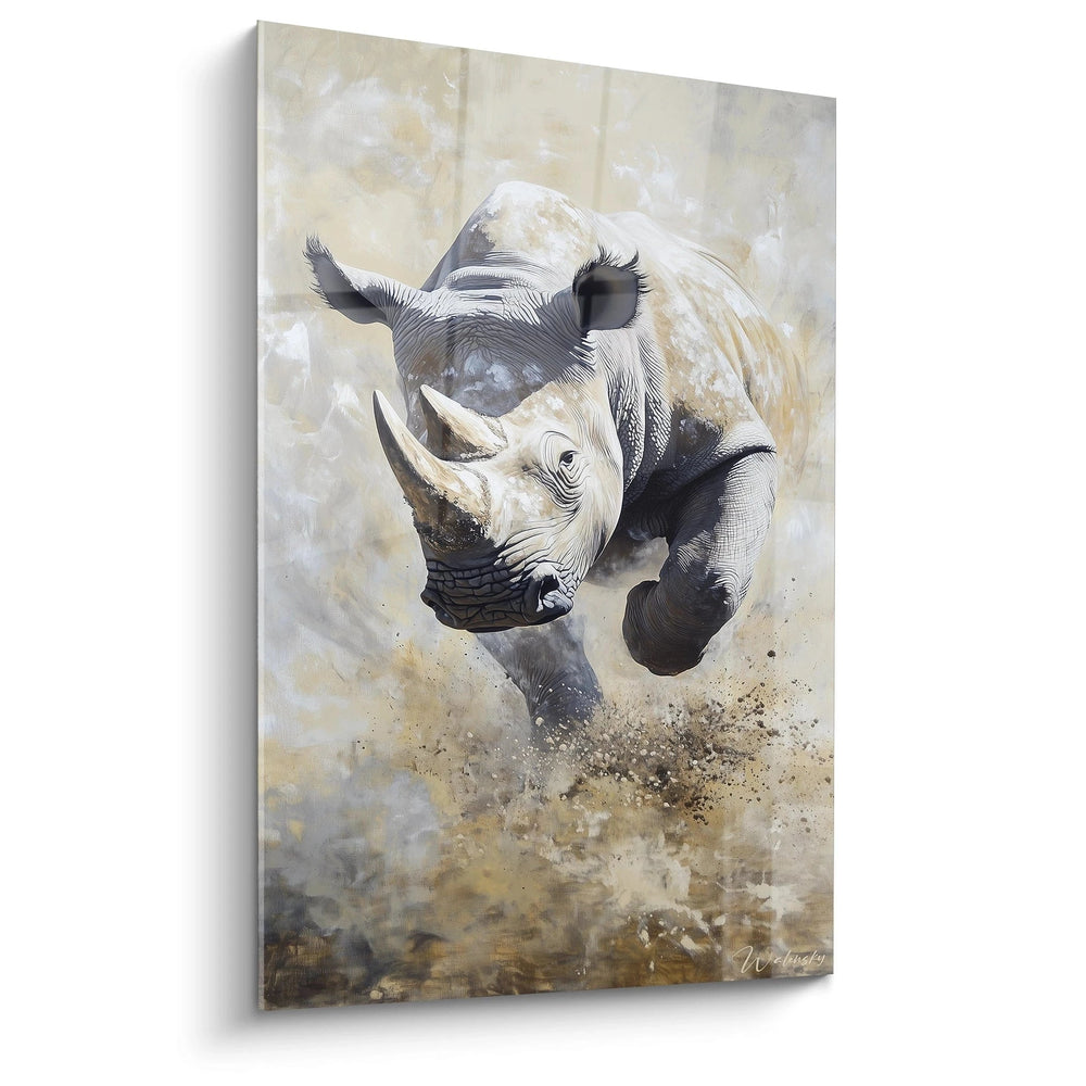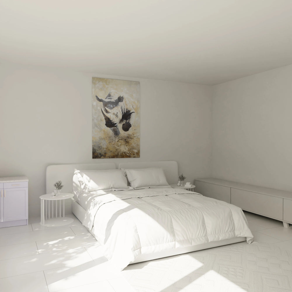 Ce tableau rhinocéros captive immédiatement par sa représentation dynamique d'un rhinocéros blanc en pleine charge. L'œuvre présente un tableau rhinocéros en mouvement saisissant de réalisme et d'énergie brute. Le sujet principal occupe le centre de la composition, créant un impact visuel immédiat qui témoigne de la puissance de cet animal emblématique. Cette décoration murale rhinocéros se distingue par son traitement artistique sophistiqué, mêlant précision anatomique et effet dramatique. L'artiste a su créer une atmosphère de tension et de mouvement qui transforme cette œuvre en véritable chef-d'œuvre animalier contemporain.