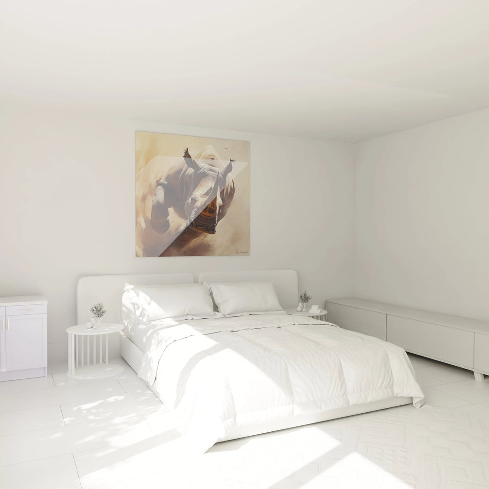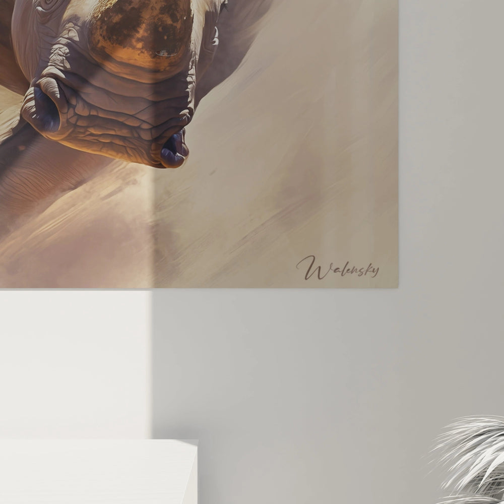 Ce tableau rhinocéros captive immédiatement par sa composition dramatique et sa palette chromatique raffinée. L'œuvre présente un rhinocéros en mouvement, saisi dans une perspective ascendante qui accentue sa prestance naturelle. Les tons chauds dominants créent une atmosphère à la fois puissante et contemplative, transformant ce tableau rhinocéros majestueux en une véritable célébration de la force brute apprivoisée par l'art. La signature discrète dans le coin inférieur droit témoigne de l'authenticité de cette décoration murale rhinocéros exceptionnelle. L'éclat subtil qui émane de la corne et des détails anatomiques confère à cette œuvre une dimension presque mystique, établissant ce tableau rhinocéros artistique comme une pièce de collection remarquable.