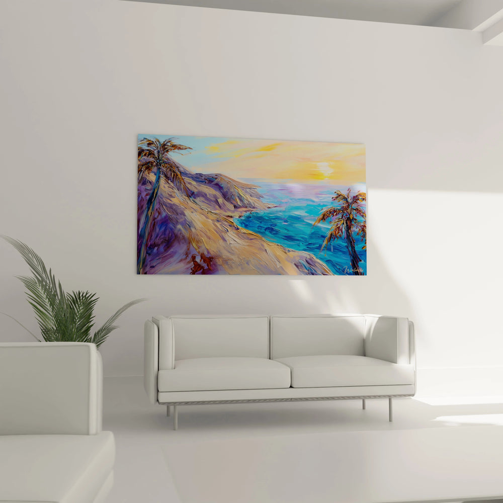 Ce tableau mer méditerranéenne captive instantanément par sa représentation saisissante d'une côte escarpée baignée dans la lumière dorée d'un coucher de soleil spectaculaire. L'œuvre présente un paysage côtier où des falaises aux teintes violacées et beiges s'élèvent majestueusement au-dessus d'une mer azur étincelante. Deux palmiers encadrent stratégiquement la composition, leurs silhouettes brunes contrastant avec la luminosité ambiante. La perspective plongeante depuis les hauteurs offre une vision panoramique impressionnante de ce littoral méditerranéen.
