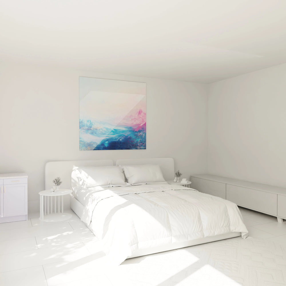 La composition de ce tableau océanique mouvement fluide suit une architecture naturelle qui guide l'œil à travers différents plans de profondeur. Le point focal se situe au centre-gauche où convergent les flux bleus et roses, créant un équilibre asymétrique harmonieux. Les lignes directrices suivent des courbes organiques qui rappellent les mouvements marins naturels. L'artiste a structuré l'espace en trois zones distinctes : la partie supérieure claire évoquant le ciel, la zone médiane où se mélangent les couleurs principales, et la base plus sombre suggérant les profondeurs océaniques. Cette art mural océanique stratifié utilise la règle des tiers de manière subtile, plaçant les éléments les plus expressifs dans les intersections naturelles du regard.