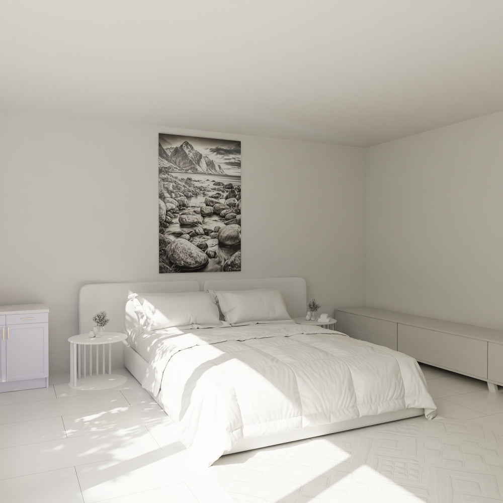 Ce tableau mural paysage nordique capture la beauté sauvage des côtes norvégiennes avec une précision artistique remarquable. L'œuvre présente un rivage rocheux scandinave parsemé de rochers aux formes arrondies par l'érosion marine, créant une composition naturelle d'une grande harmonie. Au premier plan, les galets polis par la mer forment un tapis minéral d'une texture saisissante, chaque pierre étant rendue avec un réalisme photographique. L'eau calme du fjord reflète subtilement la lumière, créant des ondulations douces qui apportent vie et mouvement à cette scène côtière nordique. En arrière-plan, les montagnes norvégiennes majestueuses s'élèvent vers un ciel dramatique, leurs sommets enneigés contrastant avec les flancs rocheux sombres. Cette représentation artistique des fjords témoigne de la grandeur de la nature scandinave, où l'eau, la roche et la montagne s'unissent dans un équilibre parfait. Le tableau décoratif Norvège révèle également quelques habitations traditionnelles nichées au pied des montagnes, ajoutant une dimension humaine à ce paysage naturel authentique.