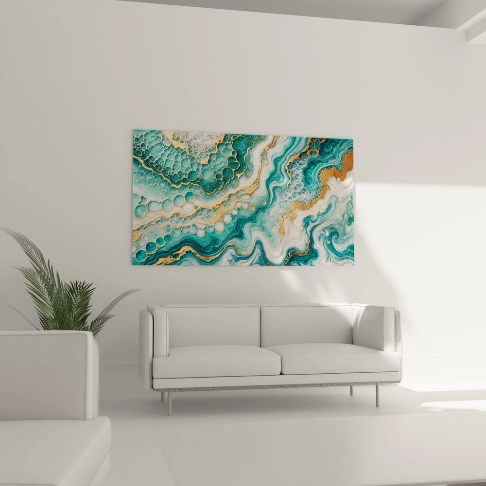 Chaque coup de pinceau et chaque coulée de résine évoquent le rythme apaisant des vagues et le scintillement doré du soleil traversant la surface de l'eau. Ce tableau déploie un kaléidoscope de couleurs fluides, où les reflets dorés se mêlent à la profondeur abyssale du bleu pour offrir un spectacle hypnotique et hypnotisant. Il évoque cette sensation unique de flotter en pleine mer, bercé par le va-et-vient des courants, un moment suspendu où l’esprit s’apaise.