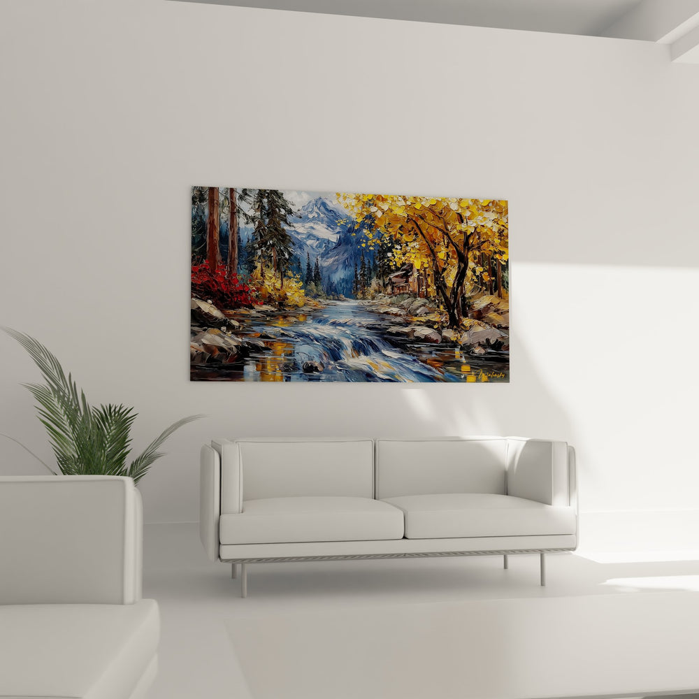 Ce tableau mural rivière de montagne capture la splendeur d'un paysage automnal où une cascade naturelle serpente à travers une forêt aux couleurs flamboyantes. L'œuvre présente une composition harmonieuse où dominent les tons dorés des feuillages d'automne contrastant avec les bleus profonds de l'eau vive. Au premier plan, la rivière tumultueuse reflète les couleurs environnantes, créant un jeu de lumière saisissant. Les arbres aux feuilles dorées encadrent majestueusement la scène, tandis qu'en arrière-plan se dressent des montagnes imposantes aux sommets enneigés. Cette peinture paysage forestier révèle également la présence discrète d'un chalet rustique niché dans la végétation, ajoutant une dimension humaine et chaleureuse à cette scène naturelle automnale. Les pinceaux ont su capturer l'essence même de cette forêt de montagne, où chaque détail contribue à créer une atmosphère de sérénité et de grandeur. Ce tableau décoratif nature transforme instantanément l'espace de vie en fenêtre ouverte sur un monde sauvage et préservé, invitant à la contemplation et à l'évasion.