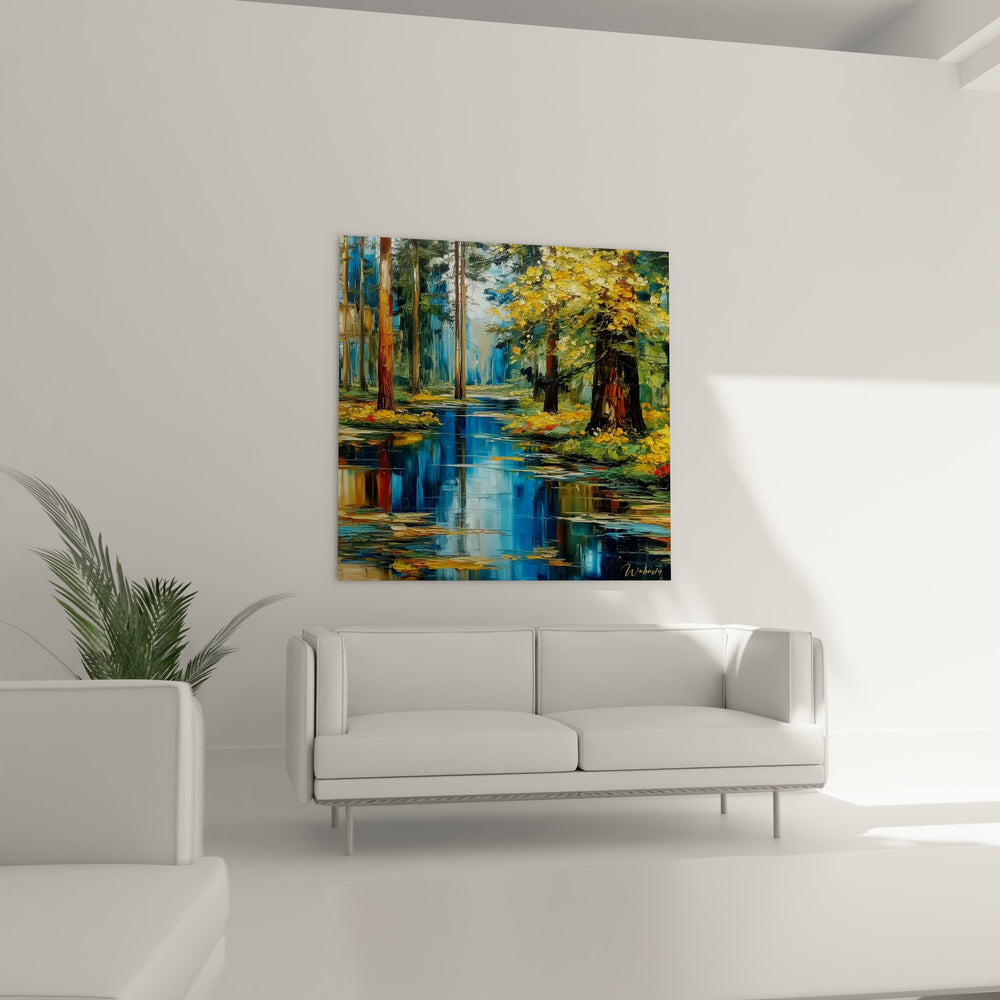 Tags : tableau forêt automne, rivière forestière, reflets dorés, peinture nature, art impressionniste