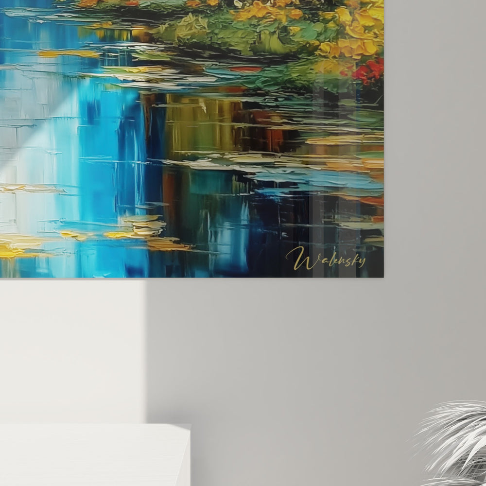 Cette œuvre s'inscrit dans la tradition des paysagistes impressionnistes, rappelant les maîtres comme Monet et ses études sur les reflets aquatiques. L'approche de Walensky évoque également l'école de Barbizon et sa célébration de la nature sauvage. Cette peinture murale nature dialogue avec les grands classiques de l'art paysager tout en apportant une vision contemporaine unique.