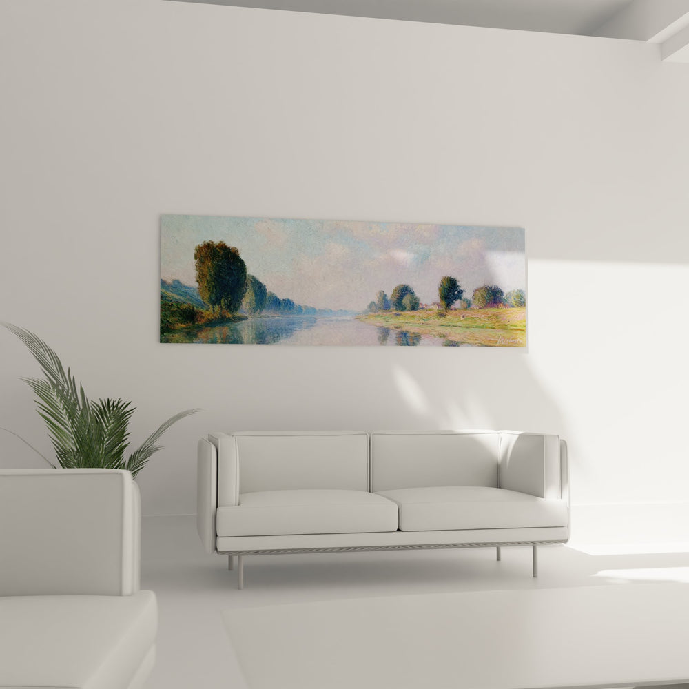 Cette peinture paysage fluvial impressionniste s'inscrit dans la lignée des grands maîtres comme Monet et ses séries sur la Seine. L'approche artistique rappelle les œuvres de Sisley et ses paysages de bords de rivière, où la lumière naturelle devient le véritable sujet de la composition. Cette esthétique impressionniste continue d'inspirer l'art décoratif contemporain.