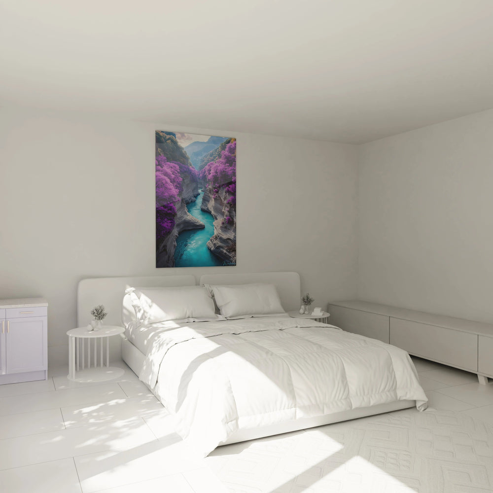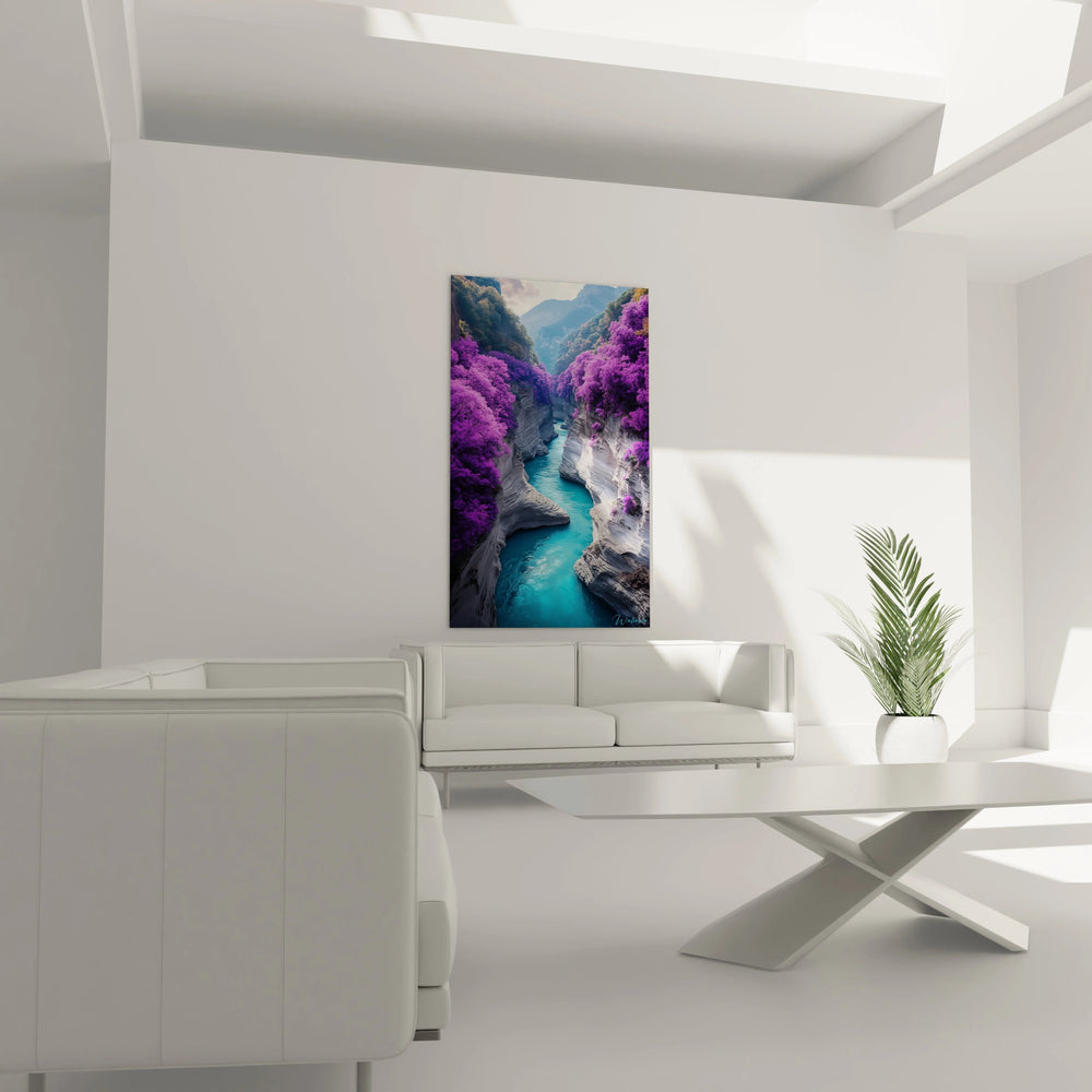 Imaginez un instant ouvrir une fenêtre sur un monde où la nature se révèle sous une forme à la fois mystérieuse et captivante. Le tableau rivière N°3 - Edition Paysage vous transporte dans cette oasis d’évasion, où une rivière turquoise serpente délicatement entre des falaises aux reflets argentés, tandis que des arbres d’un violet intense viennent éveiller votre curiosité et embellir votre espace intérieur.