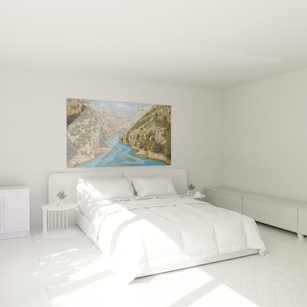 Ce tableau mural canyon présente un paysage naturel saisissant où une rivière turquoise serpente majestueusement entre d'imposantes falaises calcaires. L'œuvre capture avec un réalisme remarquable les méandres sinueux de cette voie d'eau aux reflets cristallins qui s'étendent vers l'horizon montagneux. Les parois rocheuses, sculptées par des millénaires d'érosion, révèlent leurs stratifications géologiques dans des tons ocre et beiges, créant un contraste spectaculaire avec l'azur éclatant de la rivière. La végétation méditerranéenne parsème les versants rocheux, ajoutant des touches de vert olive qui enrichissent la composition. Ce tableau gorge naturelle témoigne de la beauté brute des paysages de canyon, où l'eau a patiemment creusé son chemin à travers la roche calcaire. Les formations géologiques révèlent l'histoire millénaire de ces territoires, tandis que le ciel bleu parsemé de nuages blancs apporte une dimension aérienne à l'ensemble. Cette œuvre d'art paysage naturel invite à la contemplation et au voyage, évoquant les célèbres gorges du Verdon ou les canyons américains. L'artiste a su restituer avec précision les jeux de lumière qui caressent les parois rocheuses et font scintiller la surface de l'eau.