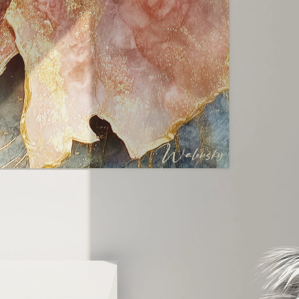 La symbolique de cette œuvre puise dans l'archétype de la féminité divine et de l'élégance suprême. L'or et le cuivre évoquent la richesse, la noblesse et la transformation spirituelle, tandis que l'effet de rayonnement suggère une aura sacrée ou mystique. Les bleus apaisants de l'arrière-plan créent un contraste harmonieux, symbolisant la sérénité et la profondeur émotionnelle. Cette palette chromatique sophistiquée haute couture allie chaleur et fraîcheur, créant un équilibre visuel parfait qui apaise tout en captivant le regard.