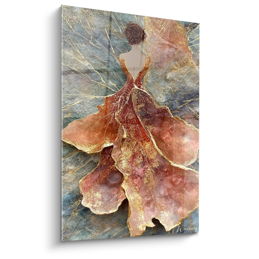 Ce tableau mural haute couture présente une représentation artistique saisissante d'une femme élégante vue de dos, incarnant la sophistication et le raffinement. La figure féminine, aux cheveux bruns élégamment coiffés en chignon, porte une robe somptueuse qui constitue le véritable cœur de cette œuvre d'art. Cette robe aux tonalités cuivrées et dorées déploie ses plis volumineux dans un mouvement fluide et théâtral, évoquant les plus belles créations de la haute couture parisienne. Les reflets métalliques qui parcourent le tissu créent un jeu de lumière sophistiqué, rappelant la brillance de la soie sauvage ou du brocart précieux. L'arrière-plan se compose de nuances subtiles de bleu-gris et d'ocre qui mettent en valeur la silhouette gracieuse. L'élément le plus remarquable de cette composition réside dans l'effet de rayonnement doré qui émane de la figure centrale, créant des lignes lumineuses qui s'étendent vers l'extérieur comme un halo mystique. Cette technique artistique rappelle les maîtres de l'Art nouveau, mêlant habilement réalisme et stylisation ornementale. L'ensemble de l'œuvre dégage une aura de luxe et d'intemporalité, parfaite pour sublimer un intérieur raffiné. Les textures riches et les contrastes chromatiques soigneusement orchestrés confèrent à ce tableau mural élégance féminine une dimension véritablement exceptionnelle.