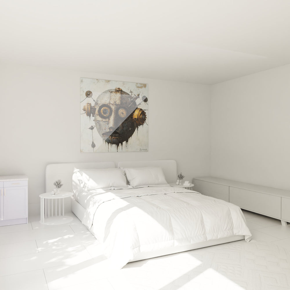 Ce tableau mural robot présente une œuvre d'art fascinante qui transcende les frontières entre l'art contemporain et l'esthétique industrielle. La composition centrale révèle un visage mécanique steampunk d'une complexité saisissante, où chaque élément raconte l'histoire d'une civilisation où la technologie et l'humanité fusionnent. Les engrenages dorés qui ornent cette création forment les yeux hypnotiques du personnage, créant un regard perçant qui semble observer l'âme de celui qui le contemple. La texture patinée et vieillie de cette décoration murale industrielle évoque les vestiges d'une époque révolue, où les machines prenaient vie. Les différents composants mécaniques - roues dentées, pistons, tuyaux et plaques métalliques - s'assemblent harmonieusement pour former cette œuvre d'art mécanique unique. La bouche, représentée par une grille métallique sombre, suggère une communication silencieuse mais puissante. Les antennes et appendices qui s'étendent de part et d'autre de la tête renforcent l'aspect futuriste de ce tableau machines et engrenages, créant un équilibre parfait entre symétrie et chaos contrôlé.