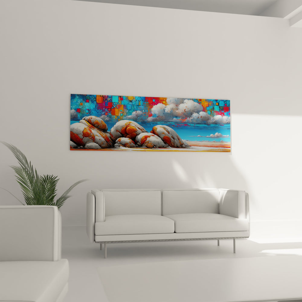 Tags : tableau rochers côtiers, art numérique abstrait, décoration murale moderne, paysage pixellisé, œuvre contemporaine