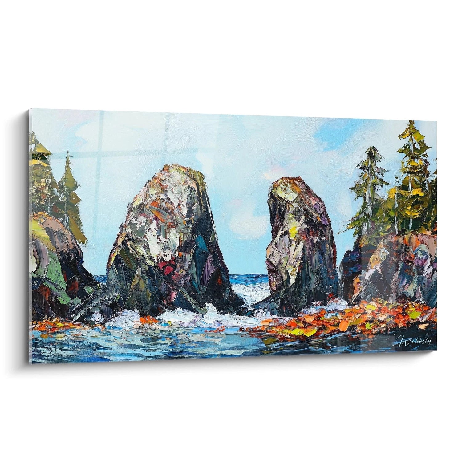 Découvrez ce tableau côte rocheuse qui capture magistralement la rencontre entre terre et mer dans une composition saisissante de réalisme expressif. Cette œuvre se distingue immédiatement par ses imposantes formations rocheuses qui se dressent majestueusement au milieu des vagues écumantes. L'artiste a brillamment saisi l'instant où l'eau turquoise vient se briser contre ces sentinelles de pierre, créant un contraste saisissant entre la solidité immuable des rochers et la fluidité éphémère de l'océan. Les conifères qui couronnent les falaises ajoutent une touche de verdure vibrante, complétant harmonieusement cette scène côtière captivante.