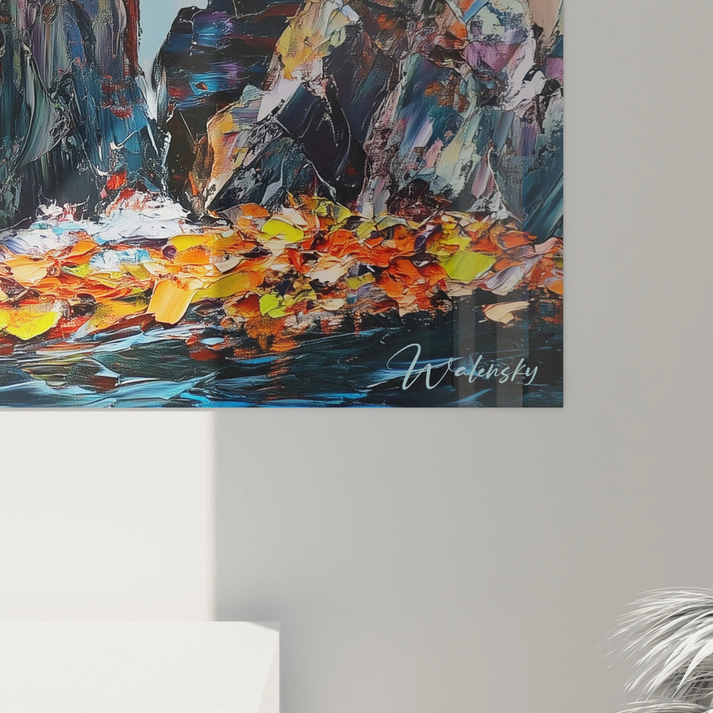 Au-delà d’un simple décor, ce tableau incarne une expérience sensorielle. Les rochers se dressent avec une présence granuleuse, presque palpable, tandis que les teintes profondes de bleus céruléens et d’outremer enveloppent la toile d’une luminosité vibrante. Vous pourrez presque entendre le murmure de l’eau, sentir cette intense énergie marine qui inspire à la fois admiration et contemplation.