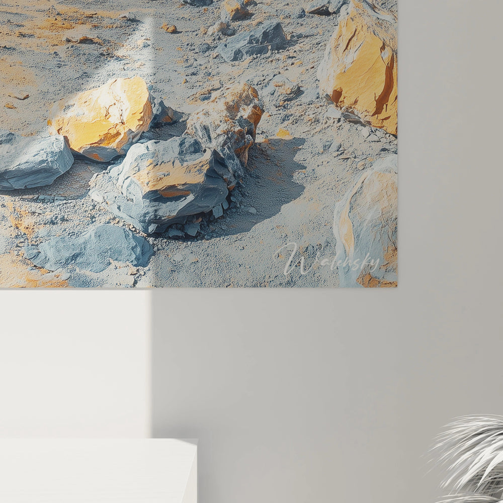 L'observation attentive de ce tableau désert aux multiples plans révèle une richesse de détails qui se découvrent progressivement. À distance, l'œuvre impressionne par sa composition majestueuse et ses contrastes chromatiques. En s'approchant, on découvre les subtilités des textures rocheuses, les variations tonales dans les ombres, et les nuances délicates du ciel. Les rochers du premier plan présentent des détails géologiques fascinants : strates, fissures, et surfaces érodées qui témoignent du passage du temps. Ce tableau désert hyperréaliste avec nuages offre ainsi une expérience visuelle qui évolue selon la distance d'observation.