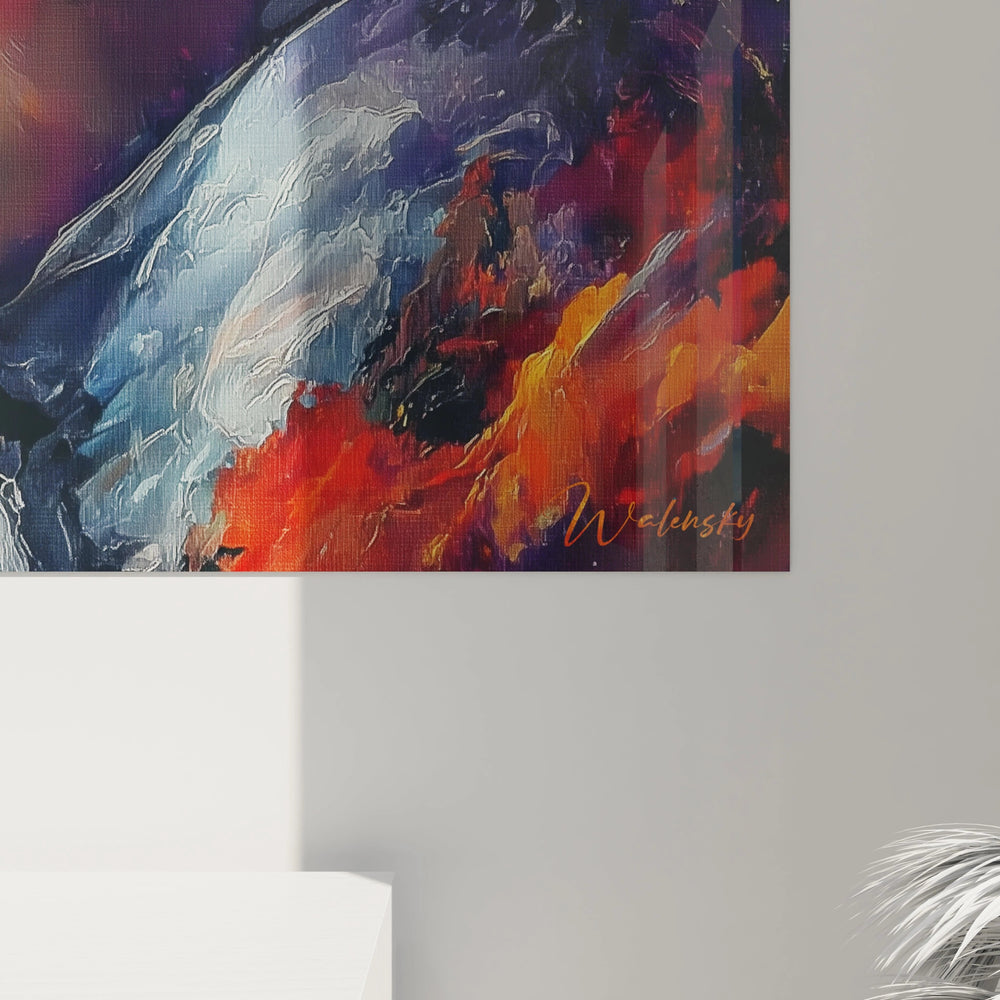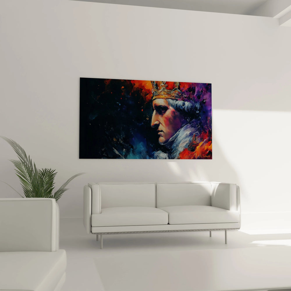 Cette art mural roi exploite magistralement les contrastes complémentaires entre oranges chaleureux et bleus glacés. L'harmonie chromatique évoque simultanément la passion royale et la sérénité contemplative, créant une ambiance émotionnelle riche et complexe. Les nuances pourpres font écho à la tradition des couleurs royales, tandis que les éclats dorés rappellent les insignes du pouvoir masculin. Cette tableau roi aux couleurs vives transforme chaque teinte en symbole de grandeur.